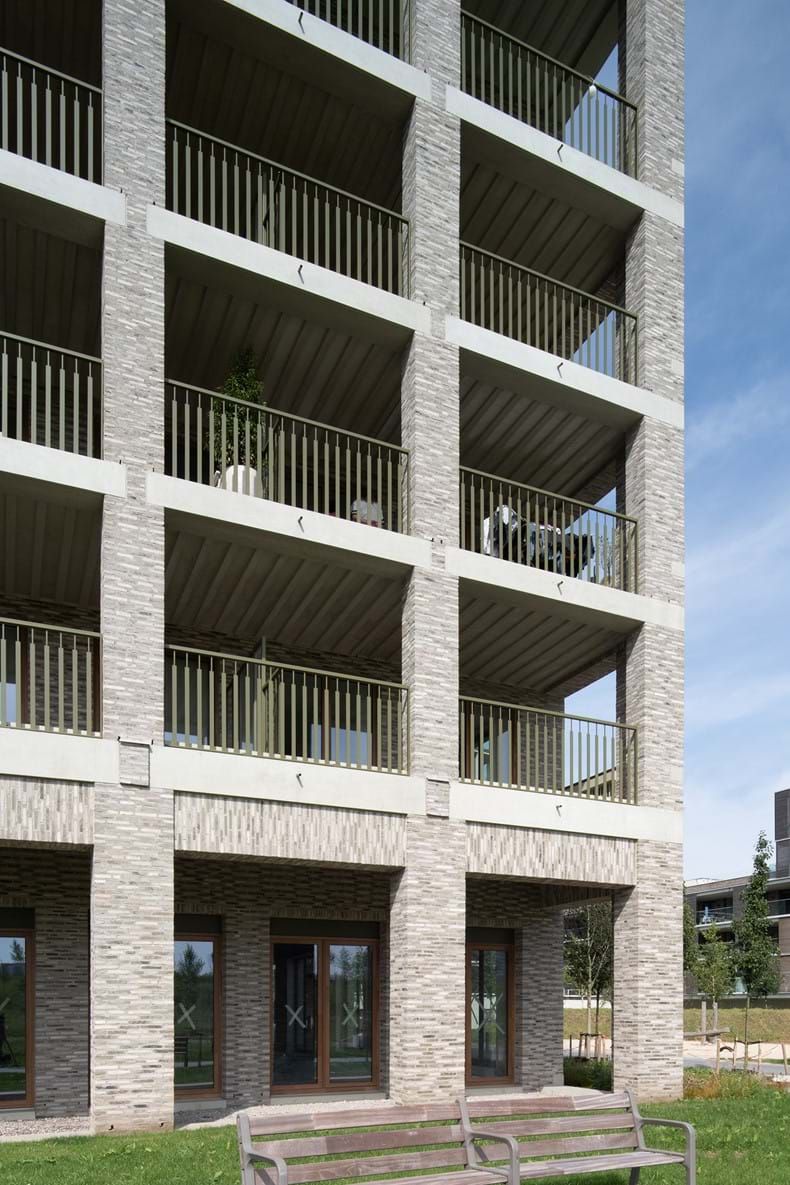 Deze twee Linea gevelstenen combineerde Hama met een transparant groen geglazuurde steen die ook in de gemeenschappelijke inkomhallen en binnenruimtes is gebruikt. Net als de gevelstenen hebben ook de glazuurstenen een Wasserstrich-textuur die door het transparante glazuur nog duidelijk zichtbaar is. Hierdoor ontstaat een heel levendig oppervlak in glans en kleurvariatie. Marco Arts: “Dat kan perfect door de ligging aan het park. In een puur stedelijke omgeving zouden we het gevelmetselwerk nooit zo ruw en natuurlijk uitvoeren, maar hier gaat het rationeel ontworpen gebouw daardoor net een heel natuurlijke relatie met de groene parkachtige omgeving aan. Zeker ook in combinatie met de betonnen elementen die eveneens in een specifieke grijsgroene kleur zijn uitgevoerd en de andere toepassingen van natuurlijke materialen zoals het naturel houten schrijnwerk en de metaalgroene stalen poorten en hekwerken. Hoewel we door de vormgeving getracht hebben het relatief kleine gebouw een minimale mate aan monumentaliteit te geven in het hele masterplan, gaat het door de materialisatie mooi op in zijn omgeving.”