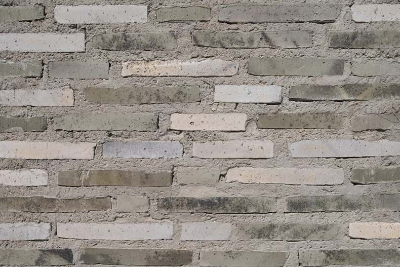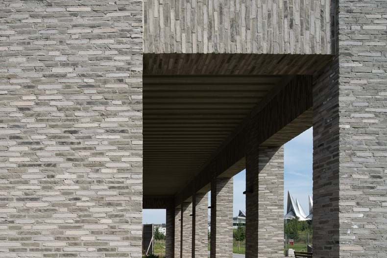 Arts: "De voegen zijn overdreven dik en ruw afgewerkt om de textuur van de bakstenen te benadrukken en massief ogende metselwerkvolumes te maken waarin de bakstenen bijna als toeslag van de mortel werken. Om dit te bereiken hebben we gezocht naar een vrij dunne en lange steen die we in wildverband toepasten. De kleur is een toon van grijsgroen die we bij Vande Moortel vonden door twee baksteensorteringen in een 50-50 mix te mengen: de Linea 7036 en Linea 7035, genuanceerde dunne gevelstenen geproduceerd volgens de populaire Wasserstrich-methode. Deze werden dus niet met een klassieke voeg van 12 mm verwerkt maar in samenspraak met de fabrikant werd voor dit doel met een voegdikte van 20 mm gewerkt. De voegen, waarbij de doorstrijkmortel MR343-2772 van Weber is toegepast, zijn uiteindelijk ook niet doorgestreken. Om het gewenste massieve effect te bekomen, hebben we geopteerd voor platvol geborstelde voegen.”