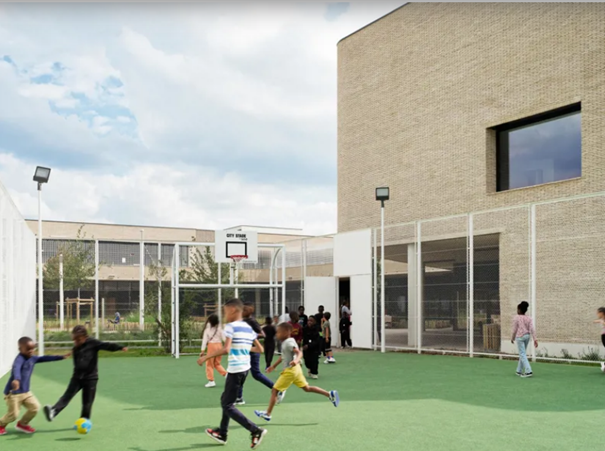 Het programma omvat een kleuterschool, een basisschool, een vrijetijdscentrum en een cultureel centrum met een multifunctionele zaal, gerangschikt rond een centrale groene zone. Deze lay-out zal ervoor zorgen dat de verschillende functies soepel naast elkaar kunnen bestaan en dat de gebruikers een duidelijke toegang hebben. “De openbare voorziening bestaat uit twee hoofdgebouwen: de kleuterschool in het oosten en de lagere scholen in het westen, waardoor kinderen zich gemakkelijker met hun school kunnen identificeren naarmate ze verder leren en evolueren”, legt de architect uit. Het project wil de locatie openen door sterke voetgangers- en visuele verbindingen met de omliggende straten te creëren. De gebouwen zijn gerangschikt rond interne binnenplaatsen, die ademruimte bieden voor kinderen en bewoners. “De speelplaats, op hetzelfde niveau als de stad, is ontworpen als een echte stedelijke oase en een potentieel plein voor de buurtbewoners. Er zijn individuele en groepsspellen, een beplant amfitheater en een schaduwrijk terras om te picknicken.”
