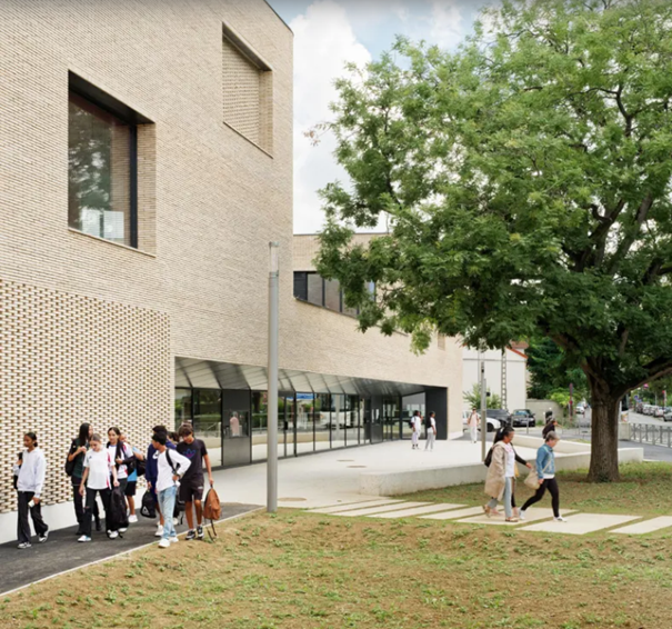 In Bondy, net buiten Parijs, ontwierp Gaëtan Le Penhuel architectes & associés een nieuw scholencomplex dat een centrale rol speelt in de herontwikkeling van een veranderende wijk. Voor het project kozen de architecten bewust voor de crèmewitte, slanke gevelsteen linea7 9001 van Vandemoortel, geproduceerd volgens de Wasserstrich-methode en gekenmerkt door zijn natuurlijke nuance en duurzame ECO-7-size label. De genuanceerde uitstraling van deze Hand-Made baksteen versterkt de verbinding met de omliggende bebouwing en onderstreept de combinatie van eigentijdse architectuur en lokale identiteit.