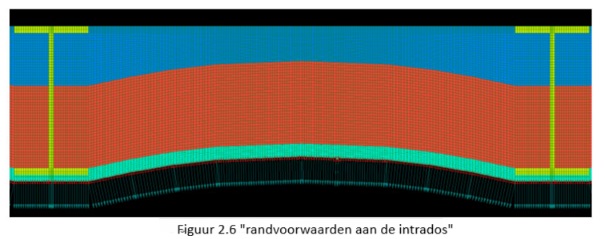 In Figuur 2.5 wordt het wiskundige model weergegeven zoals ingevoerd in de FEM-software, en in Figuur 2.6 de randvoorwaarden aan de intradoszijde van het model.
