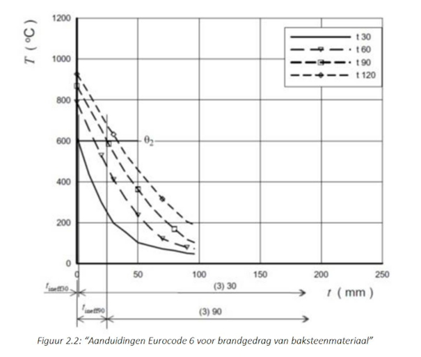 In dit specifieke geval was het niet mogelijk om gebruik te maken van de gegevens in Figuur 2.2, aangezien het bakstenen gewelf aan de intrados – dus aan de zijde blootgesteld aan brand – voorzien is van een laag Protherm Light pleister, die een bescherming tegen de brandbelasting vormt.