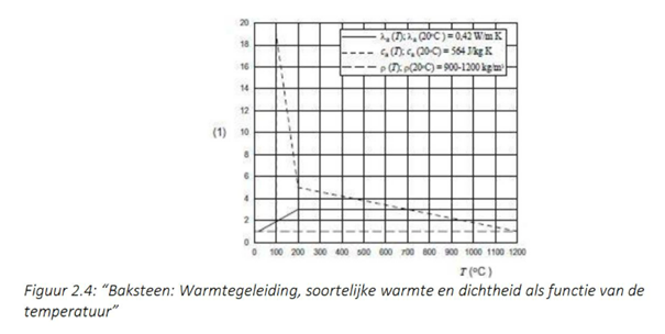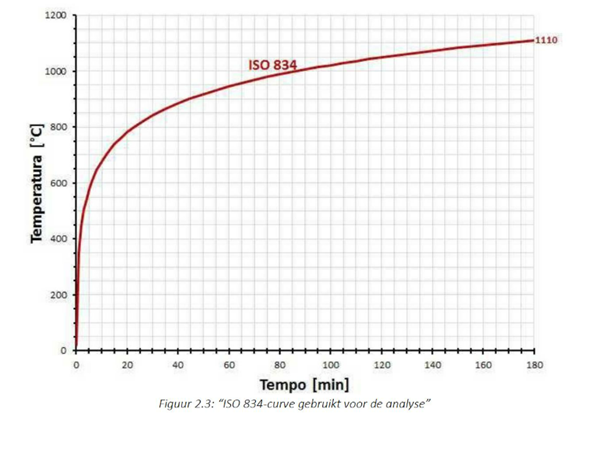 In Figuur 2.3 wordt de ISO 834-curve weergegeven die voor de analyse werd gebruikt, terwijl Figuur 2.4 de evolutie toont van de warmtegeleiding, soortelijke warmte en dichtheid als functie van de temperatuur.