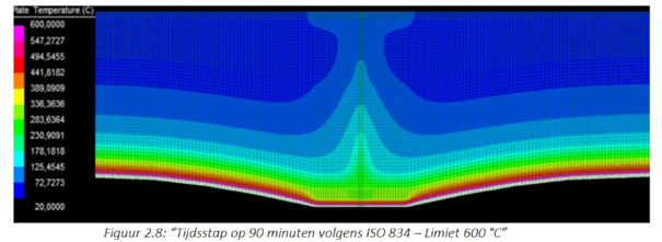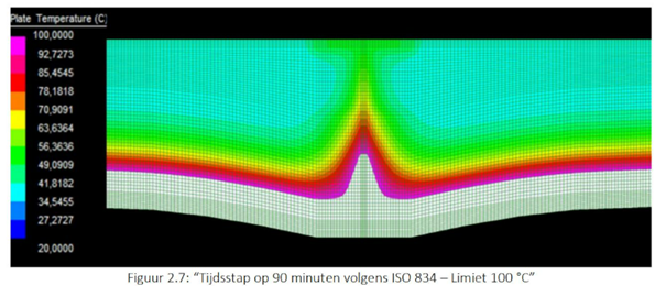 De resultaten worden weergegeven voor de tijdsstap t = 5400 seconden (90 minuten) van blootstelling aan de ISO 834 tijd/temperatuur-curve.
