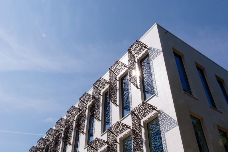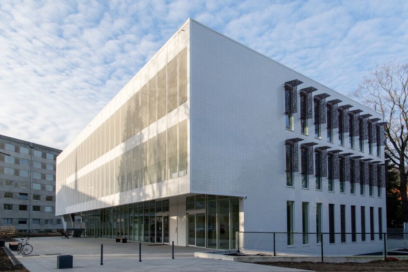 I.M.: "Doordat het een niet-geventileerd tegelsysteem is, hebben we ruimte kunnen winnen voor een doorgedreven isolatiedikte. Het risico op waterinfiltratie wordt zo tot een minimum beperkt. De fabrikant leverde de tegels op maat, tegel-en voegwerk werden afgestemd op de 90cm-modulatie van het gebouw. Dat zorgde voor een rechtlijning en zuiver lijnenspel in de gevel."