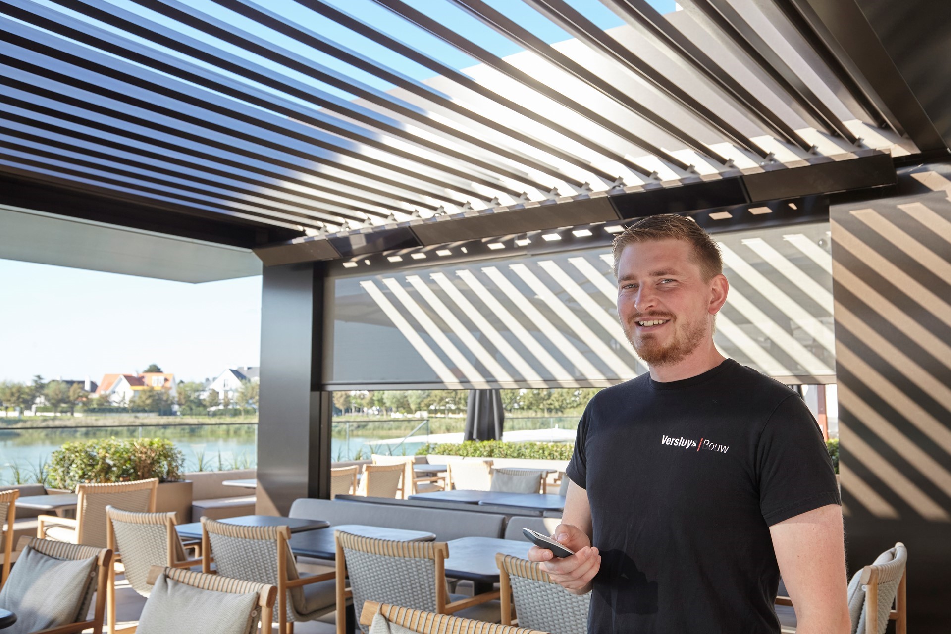 Om het ontwerp van architect Glenn Sestig te realiseren, klopte Kurt aan bij Renson-Ambassador Decoranda. Samen kwamen ze uiteindelijk tot een staalconstructie met een ingebouwd Aero lamellendak. Bij regen gaan de kantelbare lamellen dicht en zit iedereen er beschut. Bovendien valt de hoeveelheid zon of schaduw dankzij diezelfde lamellen perfect te regelen op het terras. Ook de screens temperen er de zon of wind. De verwarmingselementen garanderen tegelijk een aangename temperatuur. Het doel? Gasten enthousiasmeren om het hele jaar door buiten te verpozen.