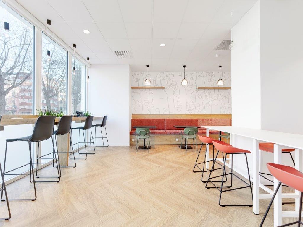 De open kantoorruimte is met behulp van mobiele systeemwanden ingedeeld in kleinere ‘vergaderbubbels’ en geluidsdichte werkplekken. Zo kunnen de werknemers zich indien nodig even afzonderen. De houtkleurige linoleumvloer in de inkomzone past perfect bij het meubilair en is in visgraatpatroon gelegd om het interieur extra cachet te geven.