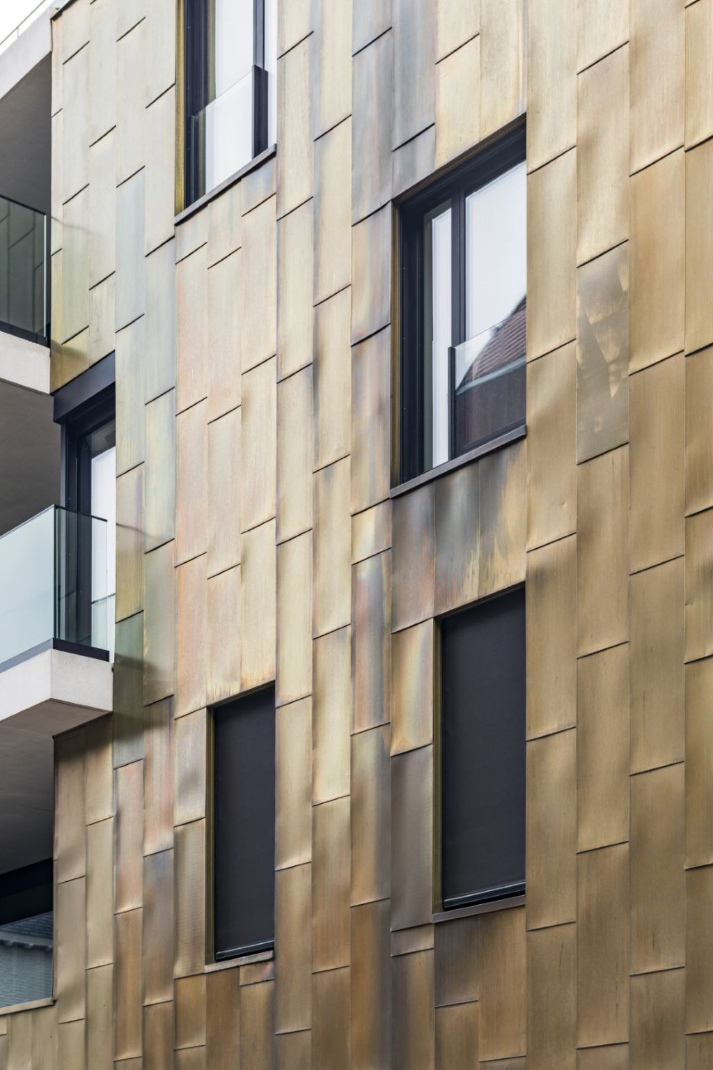 “Door de introductie van een nieuwe openbare binnenstraat op de plek van de vroegere speelplaats schakelen we publieke en semi-publieke plekken aan elkaar in de binnenstad. Dit is meteen ook de drager van het project,” beschrijft Christian Lemmens (a2o architecten) het idee achter deze duurzame ingreep als een architecturale meerwaarde voor het Hasseltse stadscentrum. Naast de assistentiewoningen bestaat Ursulinenhof ook uit een brasserie, onthaal, thuiszorg- en verpleegpost in het bouwblok met sobere baksteen en aluminium gevelafwerking. Een tweede – opvallend koperen – volume biedt ook onderdak aan de meer commerciële invullingen van het totaalproject: met orthoshop, kapsalon, kiné, logopedie en polyvalente ruimte in de glazen plint van het gebouw. Die 2 bouwblokken ‘omarmen’ de centrale ‘binnenstraat’ zoals de schoolgebouwen vroeger deden met de speelplaats. Beide volumes bestaan in totaal uit 5 bouwlagen.