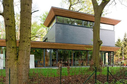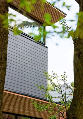 In de bosrijke omgeving van Mariakerke realiseerde architect Giovanni Declercq onlangs een passiefhuis. De uitdaging bestond erin om het omringende groen zo veel mogelijk bij de woning te betrekken. Met behulp van de ‘Alterna’-leien, ontwikkeld door Eternit, verkreeg de woning een open en massief, maar toch discreet karakter.