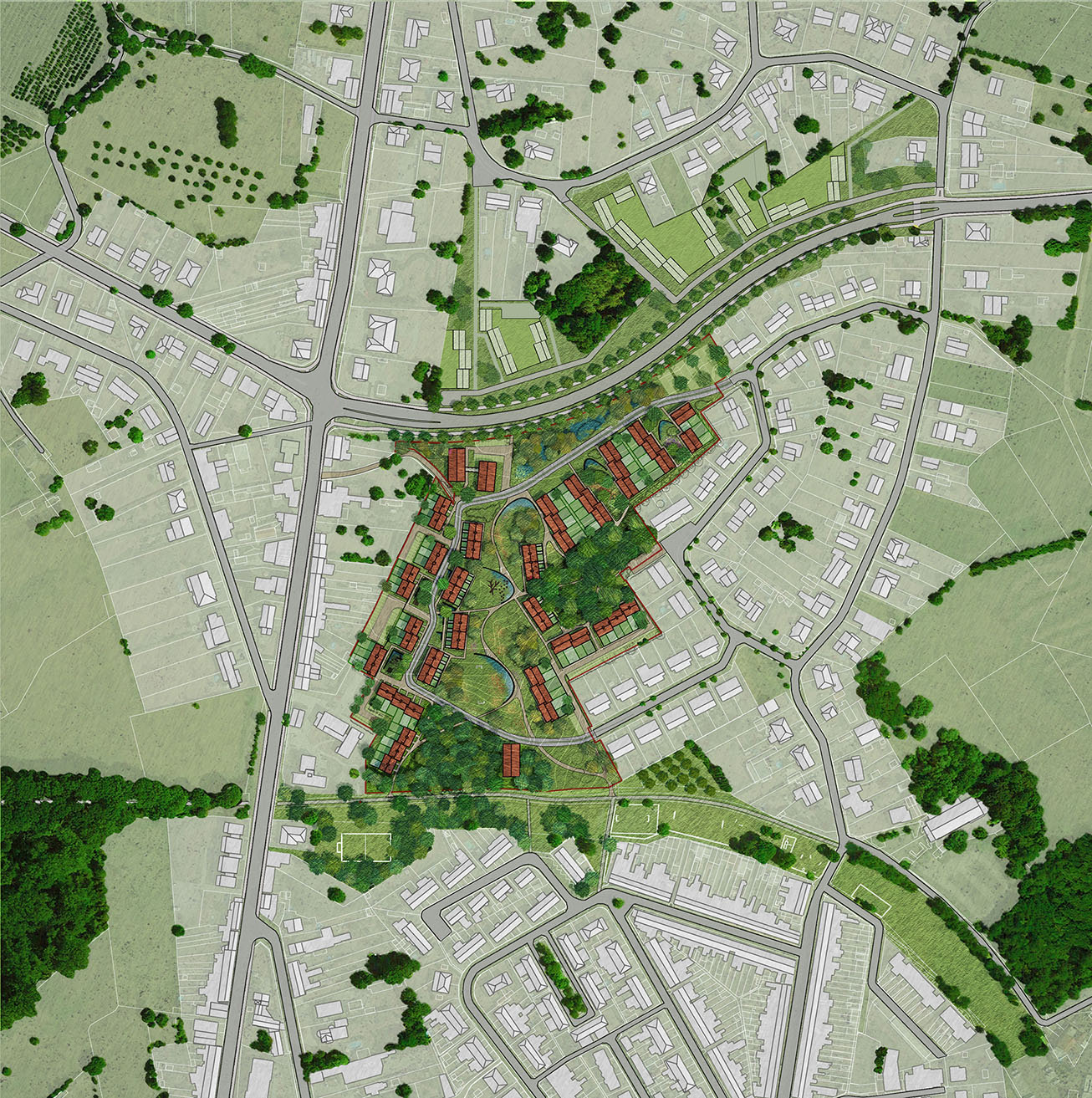 De stedenbouwkundige organisatie bouwt maximaal voort op de bestaande structuren. De kenmerkende hoogteverschillen, bestaande bospartijen, en het afbouwen van de gekartelde bouwranden vormen de uitgangspunten voor de compositie van de compacte woonvolumes met voor en achtertuinen. De bestaande bomen krijgen een centrale positie en sociale functie in landschappelijke kamers, de erven waar mensen samenwonen. Elke kamer heeft een eigen gezicht en schept binnen het gelaagde landschap van park, collectieve pleinen en private tuinen, herkenbaarheid en dierbaarheid voor haar bewoners.