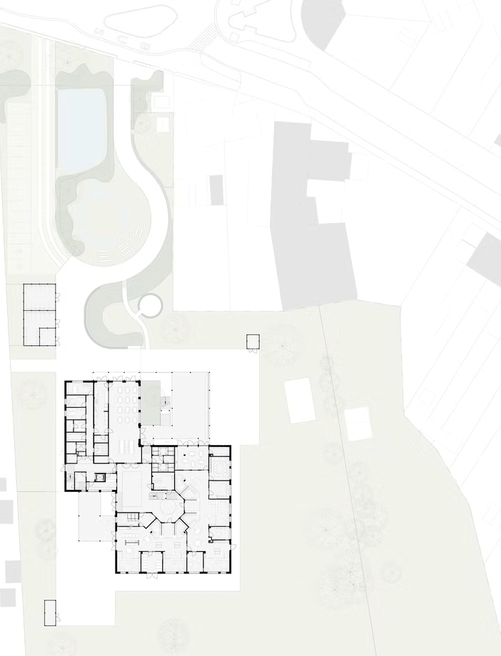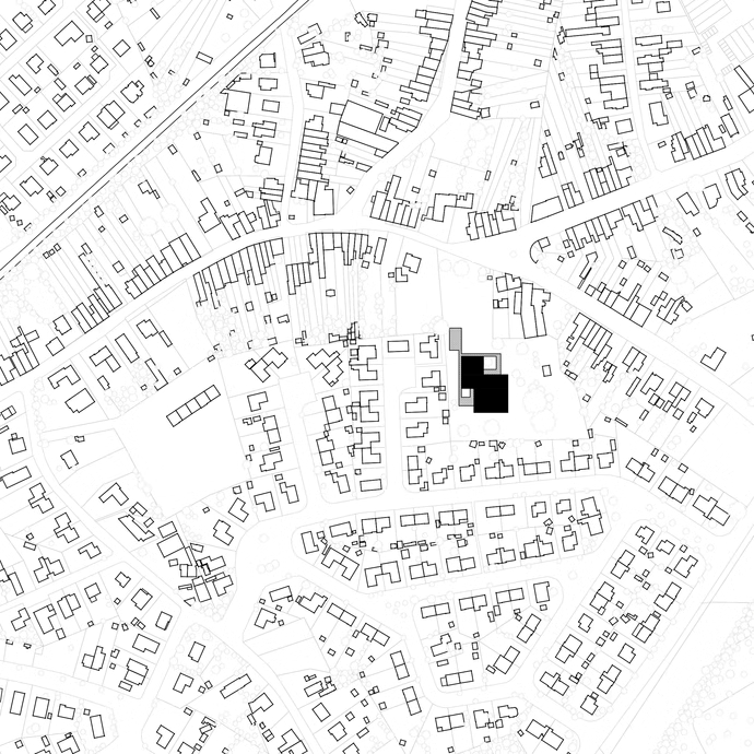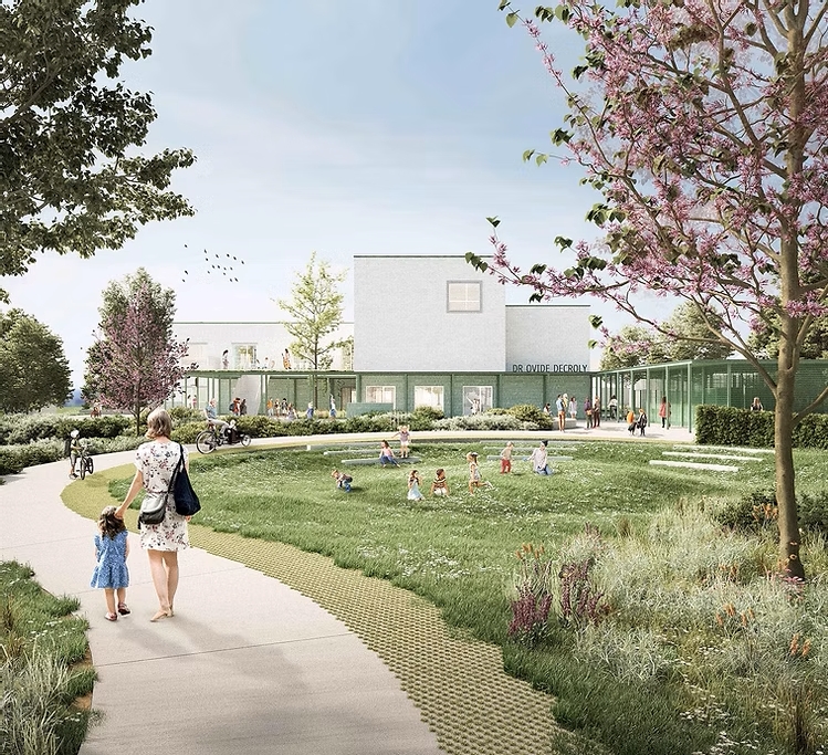 De ontwerpers kozen voor een gebouw met een minimale footprint, zodat er maximaal ruimte overblijft voor groen en spel. De nieuwbouw wordt zorgvuldig ingeplant in de oksel van het L-vormige terrein, waardoor het een ruimtelijke schakel vormt tussen drie zones: het groene voorplein aan de straatzijde, de speelruimte voor de kleuters en het speelgedeelte van de lagere school. Het voorplein kan bovendien dienstdoen als open buurtgroen. De school opent zich zo nadrukkelijk naar haar omgeving. Het gebouw is bovendien functioneel opgedeeld: vooraan bevinden zich de sportzaal en refter, die los van de rest van het gebouw kunnen worden gebruikt – ook door externe organisaties of verenigingen.