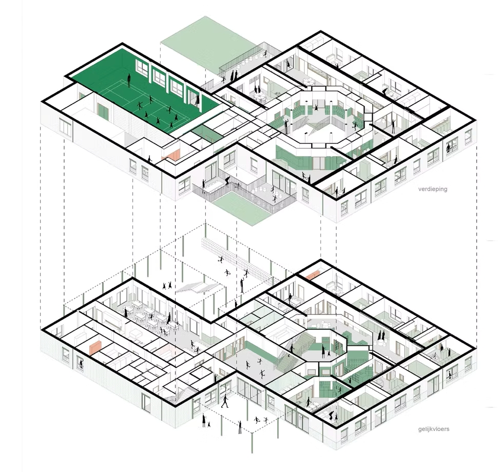 Hoewel compactheid een belangrijke randvoorwaarde was, slagen KRAS en hun partners erin om ook binnenin een lichte en inspirerende leeromgeving te creëren. Slim geplaatste buiten- en binnenramen zorgen voor doorzichten en natuurlijke lichtinval. Het centrale forum – het hart van de school – krijgt extra licht dankzij negen grote dakkoepels. Die forumruimte vormt een ontmoetingsplek, een circulatiezone én een flexibele projectruimte waar thematisch en interdisciplinair gewerkt kan worden.