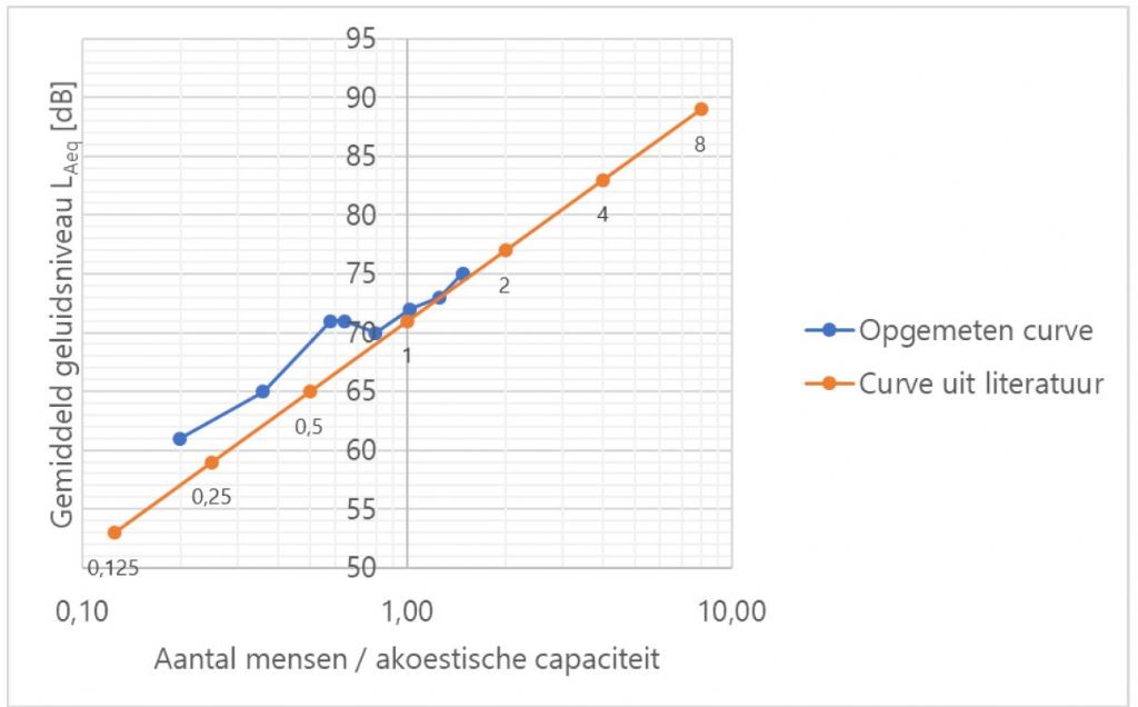 Er is een relatief eenvoudige relatie tussen het aantal mensen dat men kan plaatsen en de ruimteakoestiek. De bepalende parameter heet de “akoestische capaciteit”. Bij deze bezetting treedt er een geluidsniveau op van 71 dB, wat nog als comfortabel bevonden wordt.