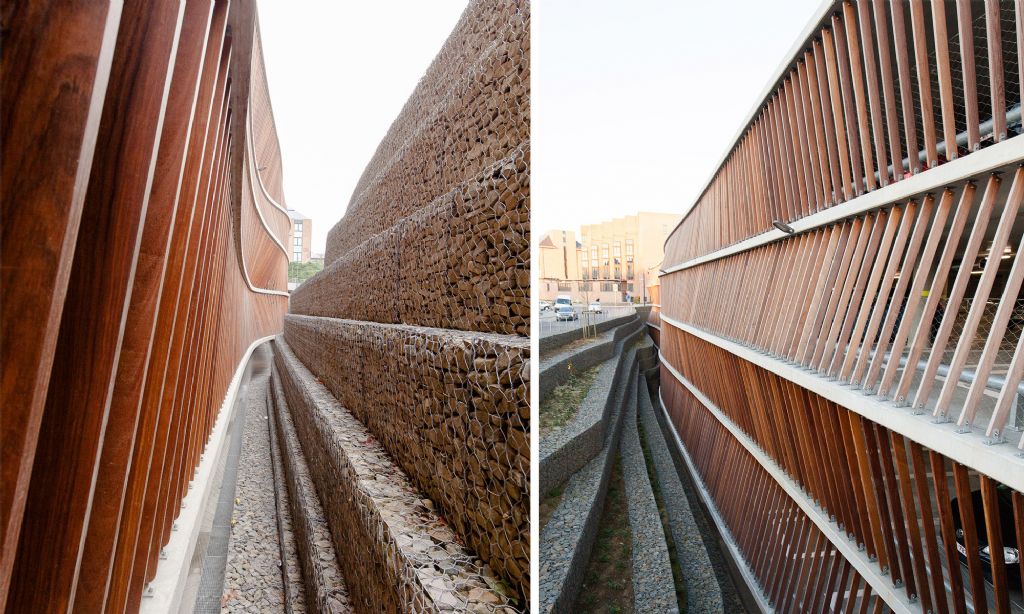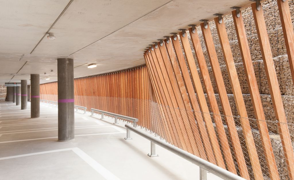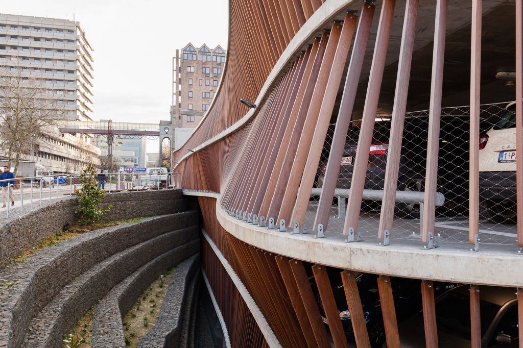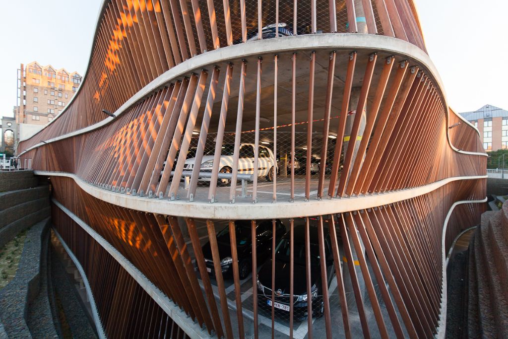 De golvende gevels bepalen het beeld van deze half ingegraven parkeergarage. Tussen de gevel en de stoep overbrugt het landschapsontwerp het aanwezige hoogteverschil. De golvende randen verschillen per verdieping en worden gevolgd door de hardhouten lamellen. Zo creëren ze een meanderend beeld.