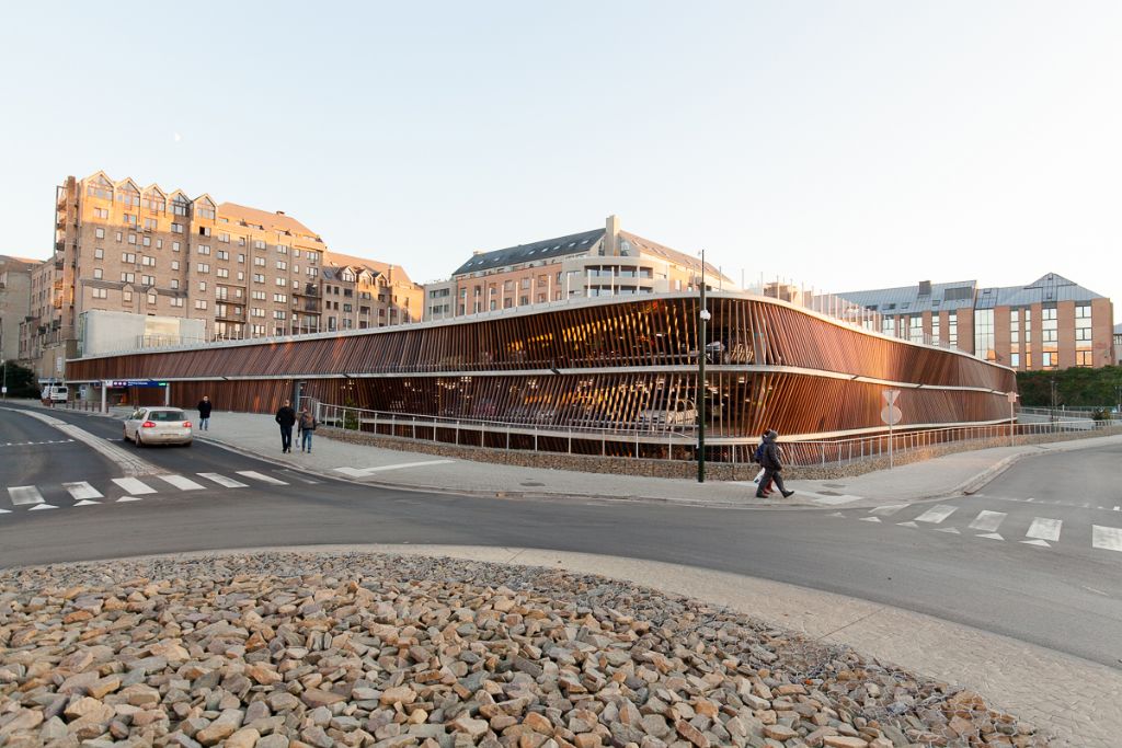 Parkeergarages hoeven niet altijd een louter functionele, industriële look te hebben. Dat bewijzen MODULO architects en de Jong Gortemaker Algra met de parkeergarage voor het Universitair Ziekenhuis Saint-Luc in Sint-Lambrechts-Woluwe. De golvende gevel uit hardhouten lamellen geeft het gebouw een warme uitstraling.
