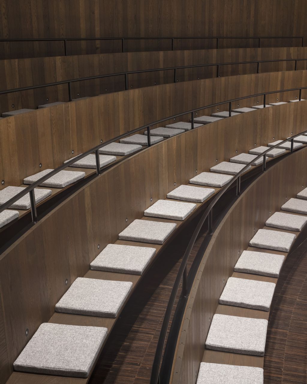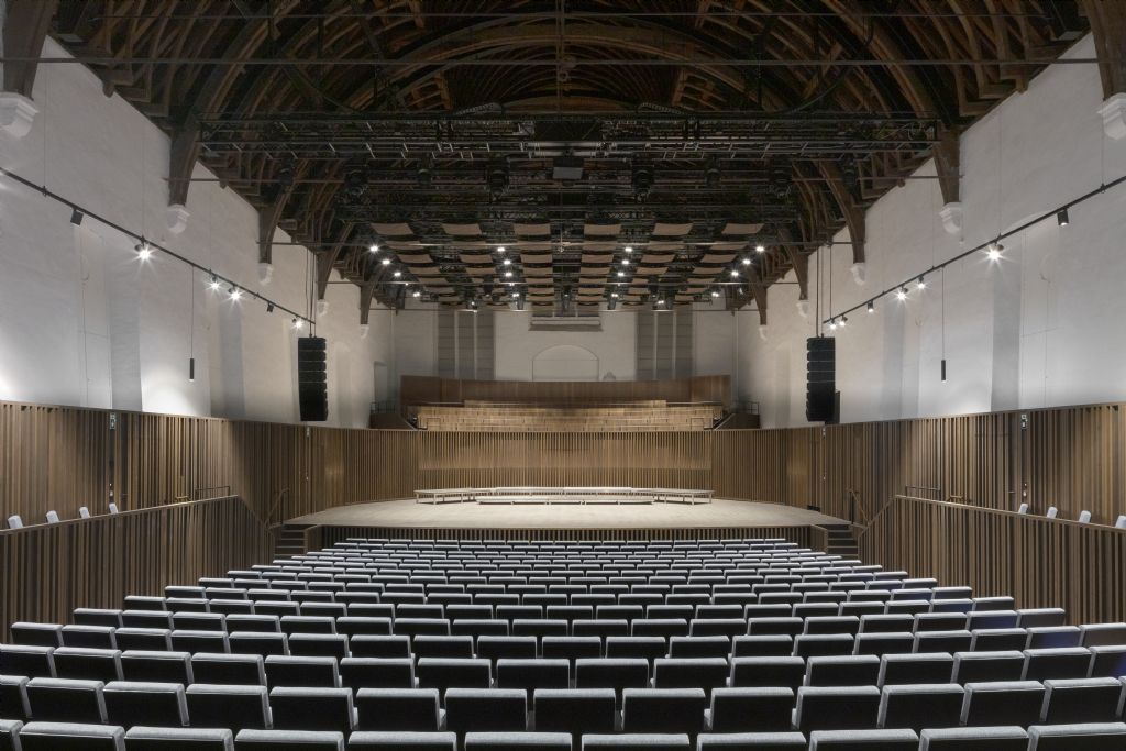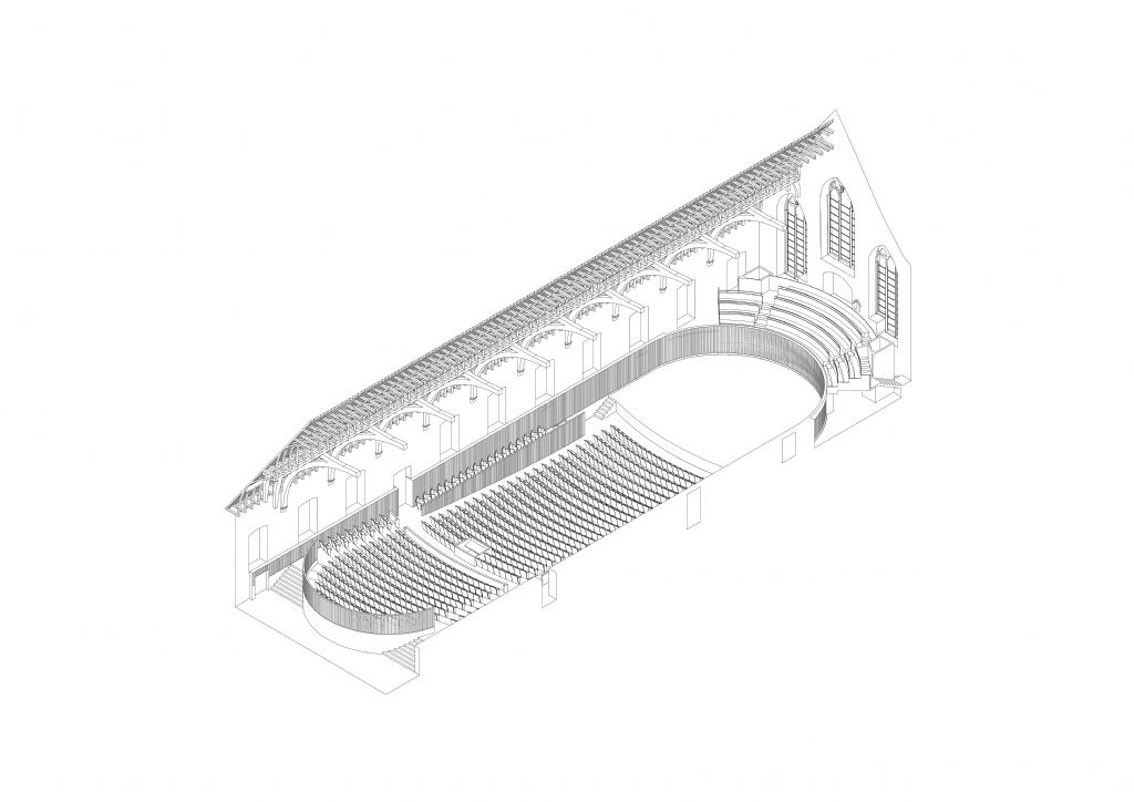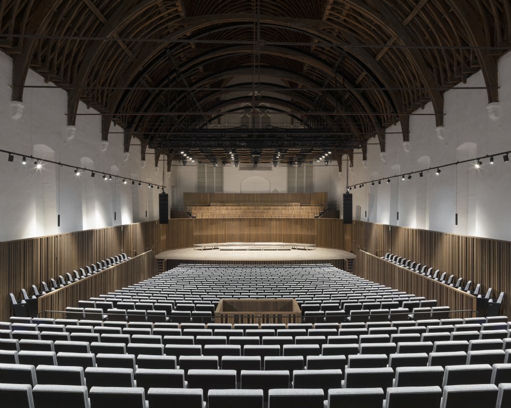 De bestaande muren van het middeleeuwse gebouw zijn in de loop der tijd licht naar buiten gekanteld onder het gewicht van de zware houten dakconstructie, waardoor het geluid naar boven weerkaatste en in het dakgebinte verdwaalde. Dit wordt gecorrigeerd door een nieuwe houten wand die zowel het zitgedeelte als het podium omhult als een doorlopende, omringende lambrisering en de directe geluidsreflectie verzorgt. De plangeometrie weerspiegelt het gewelfde dak en de gearticuleerde akoestische materialisering in gerookt eikenhout brengt de ruimte visueel in balans. Het nieuwe geheel van zittribune en podium wordt binnen de historische zaal gepositioneerd en is opgevat als een zorgvuldig vervaardigd akoestisch houten instrument dat de bestaande ruimte stemt tot een passende intieme sfeer waar het publiek als het ware omarmd door muziek binnen deze waardevolle historische context.