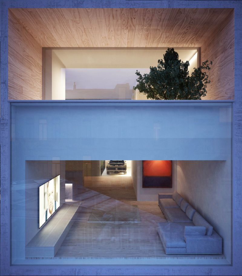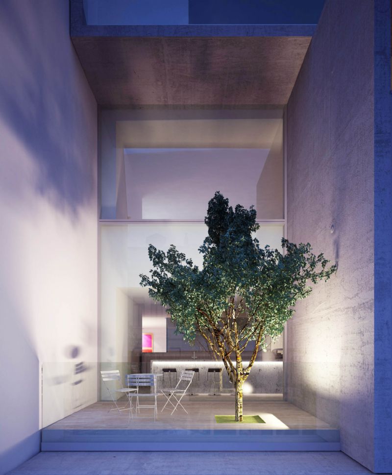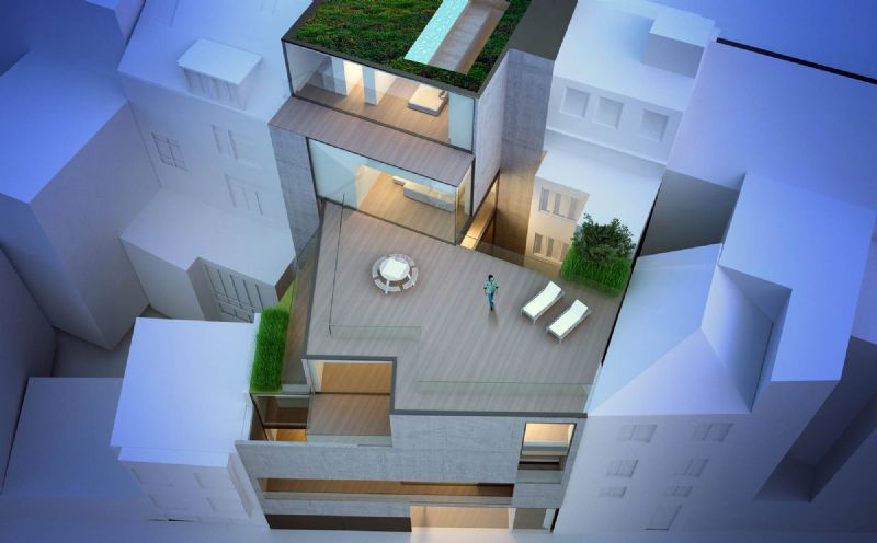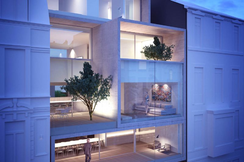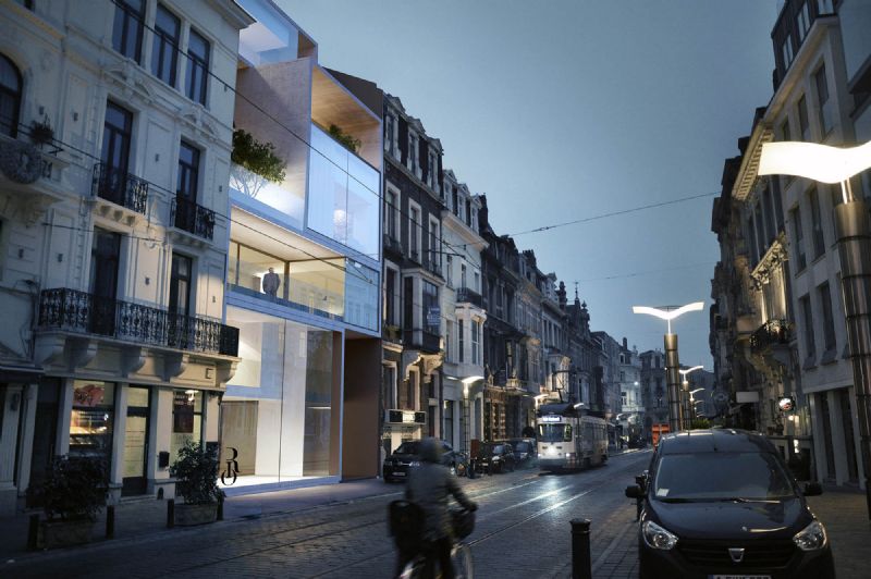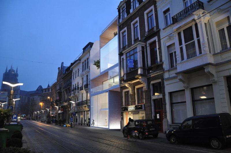 De transparante, met beton omkaderde volumes herbergen een exclusief handelspand met dubbelhoge winkelpui en vier luxueuze appartementen, waaronder één duplex penthouse. De effen buitenafwerking van het architectonische beton sluit aan bij de gepleisterde gevels elders in de straat. De tactiele sporen van de horizontale plankenbekisting binnenin voeden op hun beurt de huiselijkheid van het interieur. De entiteiten richten zich naar de al aanwezige en door Govaert & Vanhoutte uitgebreide open ruimtes van het bouwblok. Door enerzijds bestaande gemene muren opmerkelijk te verlagen en anderzijds met de ontwikkelde nieuwbouwvolumes afstand te nemen, is de lichttoetreding in de verblijven op een hoog niveau gebracht.
