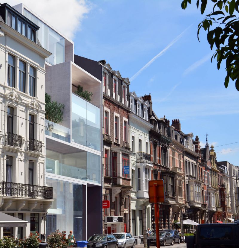 Door een afwijkend en ontluisterend pand uit de jaren zeventig te vervangen door een wiskundig doordacht maar sterk hedendaags gekarakteriseerd project, herstelt het bureau het straatbeeld. De schijnbaar willekeurige stapeling van volumes verwijst dankzij de intensieve toepassing van de gulden snede namelijk naar de gevels van de naastliggende bouwwerken, die op dezelfde manier in verhouding zijn gebracht. Tegelijk vinden de doorlopende verdiepingshoogtes aansluiting bij de aanpalende panden van de Notarisstraat aan de achterzijde.