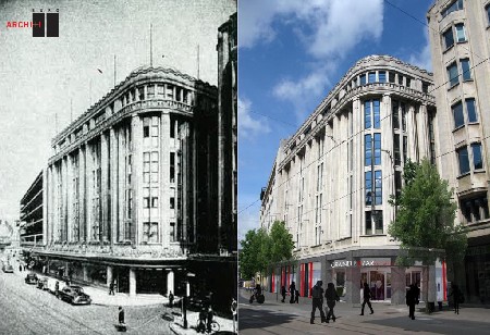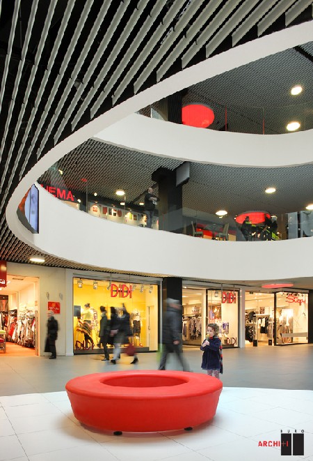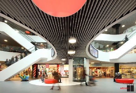 Tot slot wordt intern een nieuwe dynamische vormentaal geïntroduceerd die ‘flowing spaces’ ontwikkelt. De centrale passerelle op de eerste verdieping, in combinatie met een herpositionering van de roltrappen, laat circulatiestromen in elkaar overvloeien. Eenzelfde vormentaal zit ook in de plafonds, de verlichting, het kleurgebruik,… wat de overdaad op vandaag stroomlijnt.