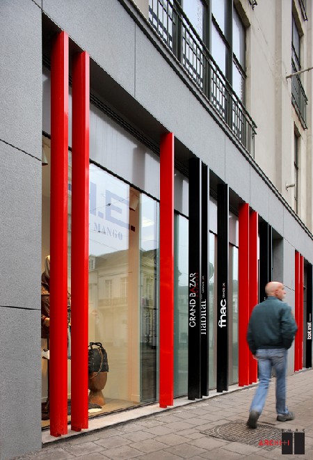 Grand Bazar Antwerp wordt opnieuw een merknaam die kwaliteit uitstraalt met wit, zwart en fluweelrood als eenvoudige en tijdloze kleuren. De keuze voor deze neutrale kleuren biedt een drager voor de advertising van de shops zelf. Ook in het straatbeeld wordt het shoppingcenter versterkt door het gebouw te gebruiken als ‘affiche’ naar de stad toe. Een voorzetstructuur met lamellen brengt eenheid in het sterk versnipperde gelijkvloers en uniformiseert etalages, toegangen en blinde delen.