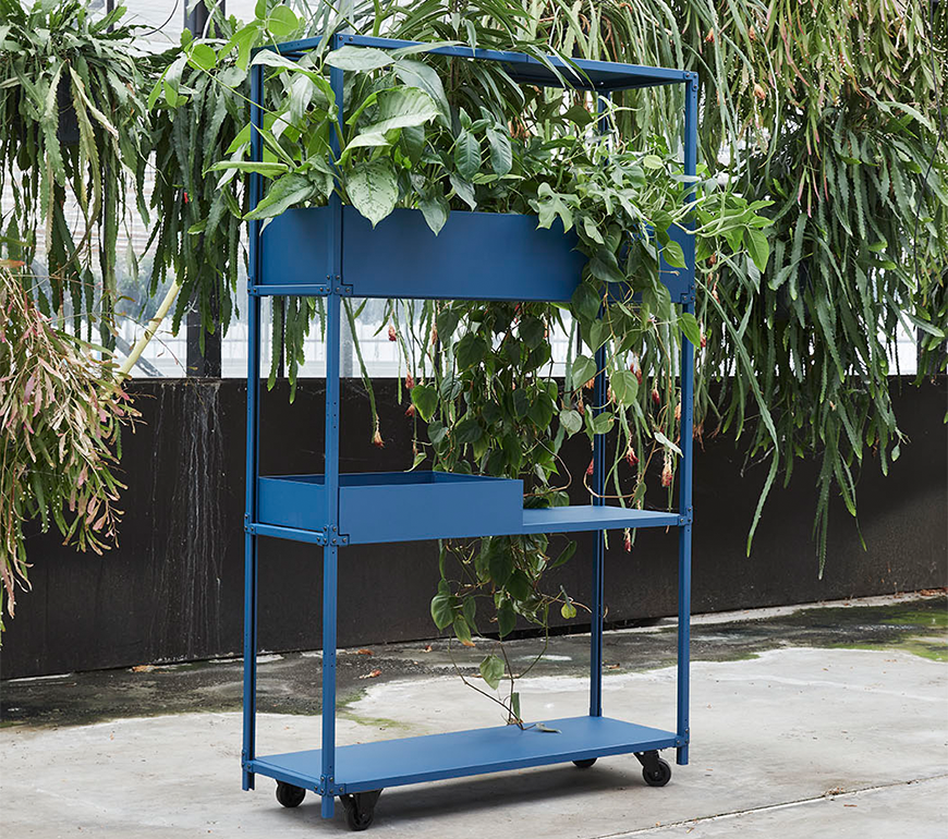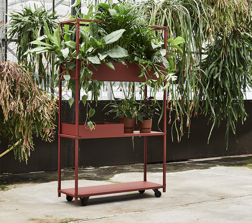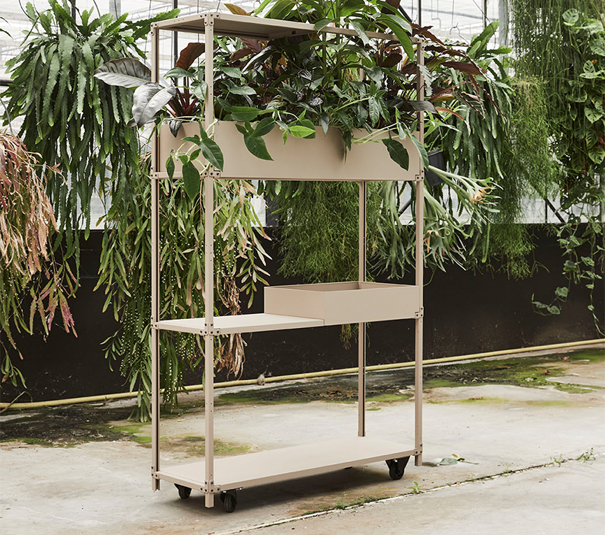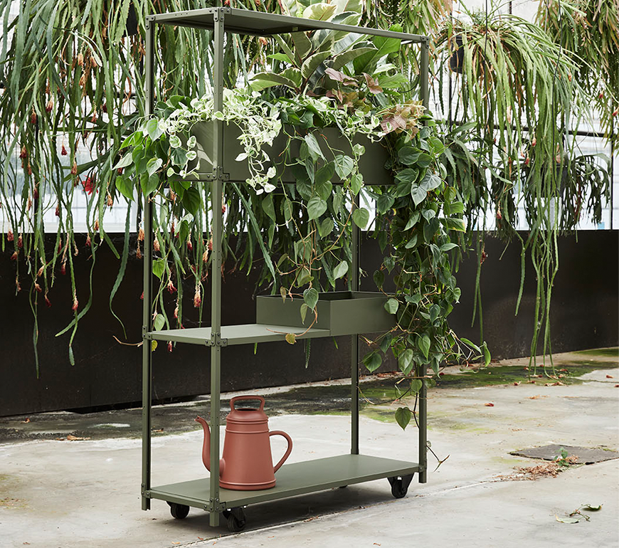 Vanuit deze gedachte is dit modulaire systeem bedacht. Schakelbare eigenwijze kasten die op tal van manieren zijn in te delen en aan te vullen door een divers scala aan accessoires. De vorm van de Green Cabinet is geïnspireerd op de verrijdbare ‘Deense karren’ op de bloemenveiling met hun lichte constructie en technische uitstraling. Een uniek systeem dat op een speelse, karaktervolle manier de ruimte verrijkt met planten.