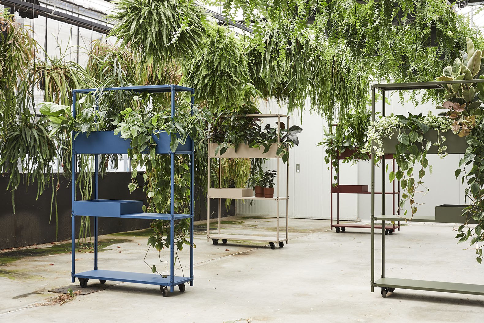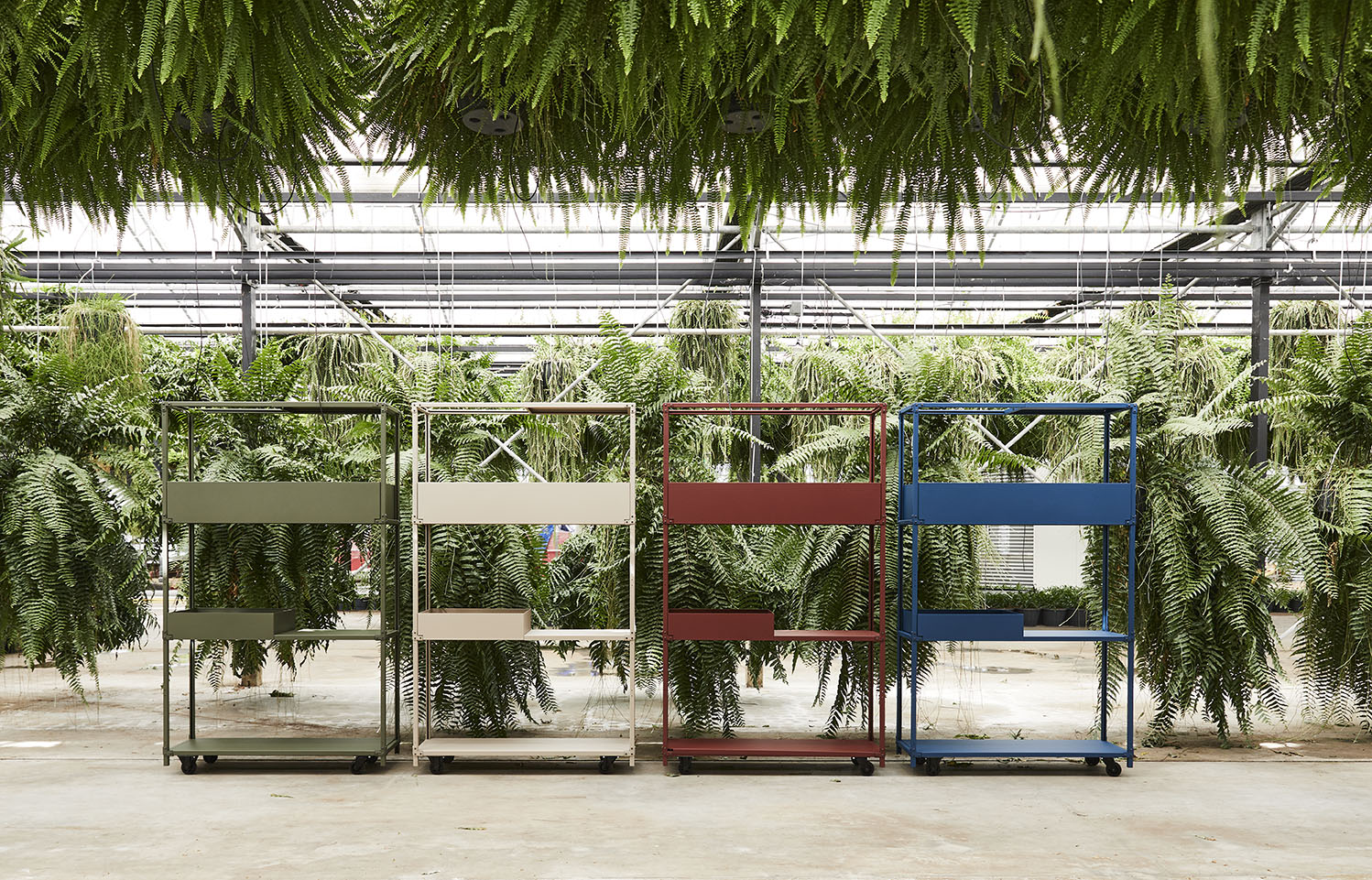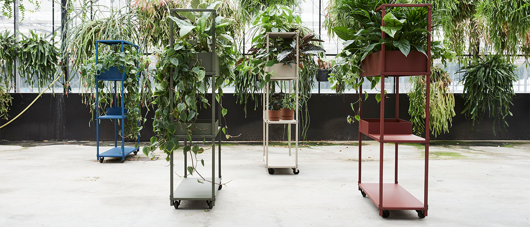 Vanuit deze gedachte is dit modulaire systeem bedacht. Schakelbare eigenwijze kasten die op tal van manieren zijn in te delen en aan te vullen door een divers scala aan accessoires. De vorm van de Green Cabinet is geïnspireerd op de verrijdbare ‘Deense karren’ op de bloemenveiling met hun lichte constructie en technische uitstraling. Een uniek systeem dat op een speelse, karaktervolle manier de ruimte verrijkt met planten.