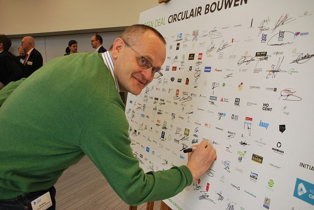 Meer dan 200 organisaties ondertekenden op vrijdag 22 februari de ‘Green Deal Circulair Bouwen’. Daarmee tonen de bouwbedrijven, bouwmateriaalproducenten, lokale en regionale overheden, architecten, private bouwheren, onderzoekers en andere organisaties hun engagement om in de toekomst circulair bouwen in Vlaanderen tot dagelijkse realiteit te maken. Ook Redactiebureau Palindroom en architectura.be zetten mee hun schouders onder dit project.
