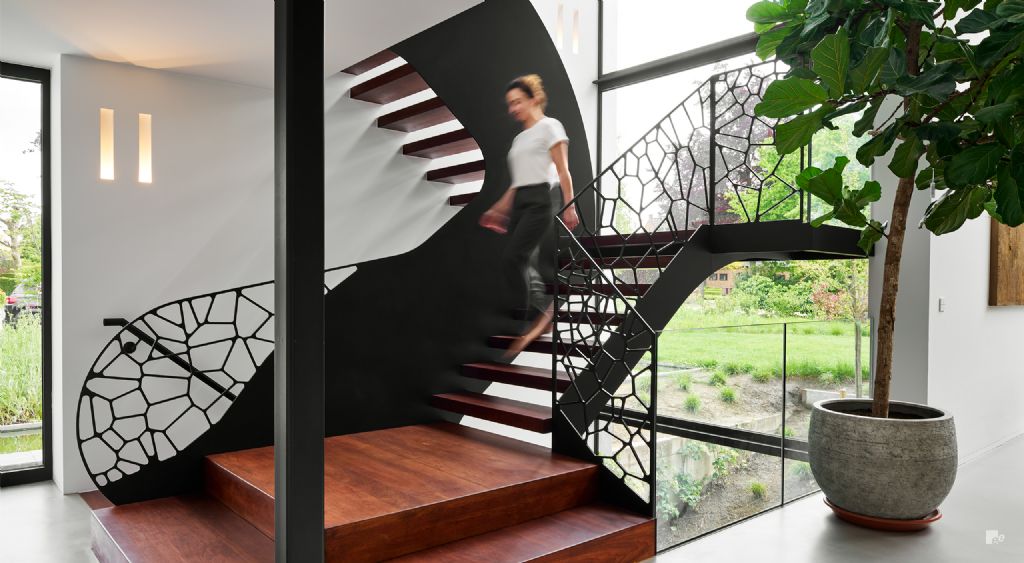 De balustrade op deze trap in een huis in Lochristi is, in samenspraak met Anneleen Windey Architectuur, voorzien van de stalen Cells™ balustrade van EeStairs. Deze Cells™ balustrades worden gemaakt door een uniek geometrisch programma wat voor het open-vloeiende weefpatroon zorgt. De Cells™ zijn niet alleen artistiek: de klant wilde een veilige balustrade met goede grip voor de (groot)ouders en kinderen.