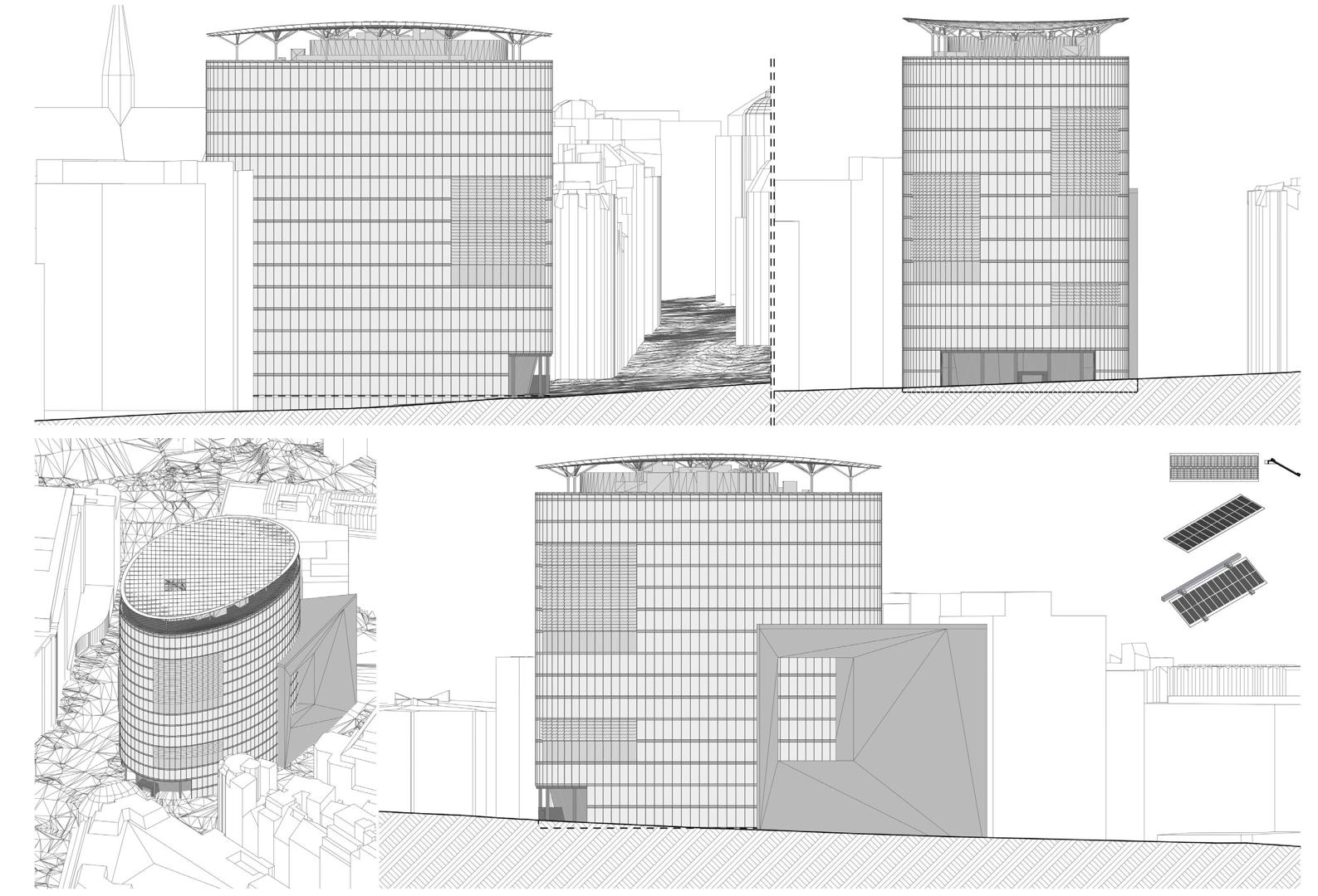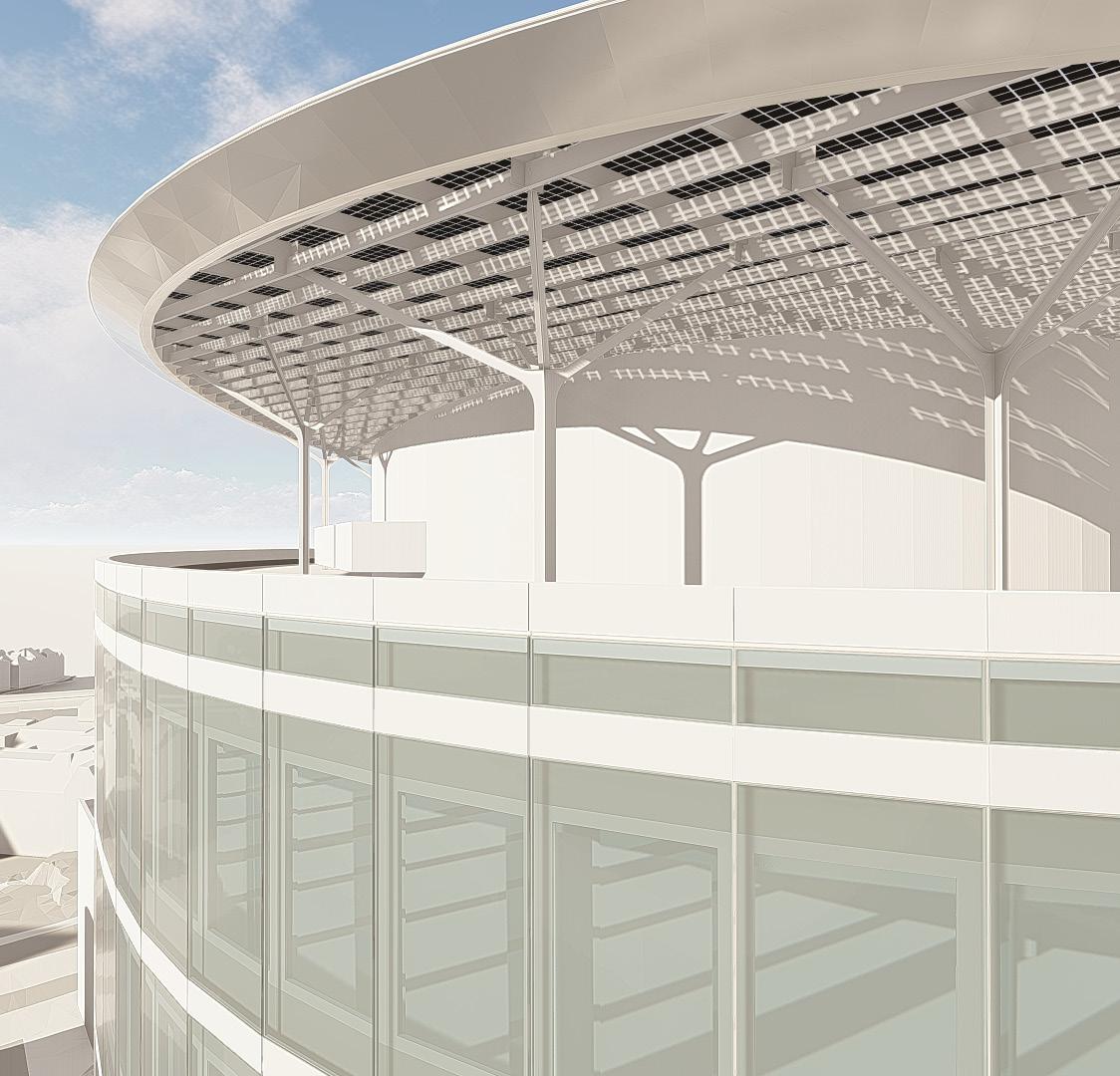 Het voorstel van Ney & Partners BXL en Sunsoak Design omvat een grote, licht gebogen fotovoltaïsche luifel op het dak. Die kromming zorgt niet alleen voor maximale zonne-opbrengst, maar helpt ook om de impact op het skylinebeeld te beperken. Zo ontstaat er een subtieler silhouet dat zich goed voegt in het Brusselse stadslandschap. De nieuwe luifel sluit visueel aan bij de bestaande technische volumes op het dak, die momenteel erg aanwezig zijn in het straatbeeld.