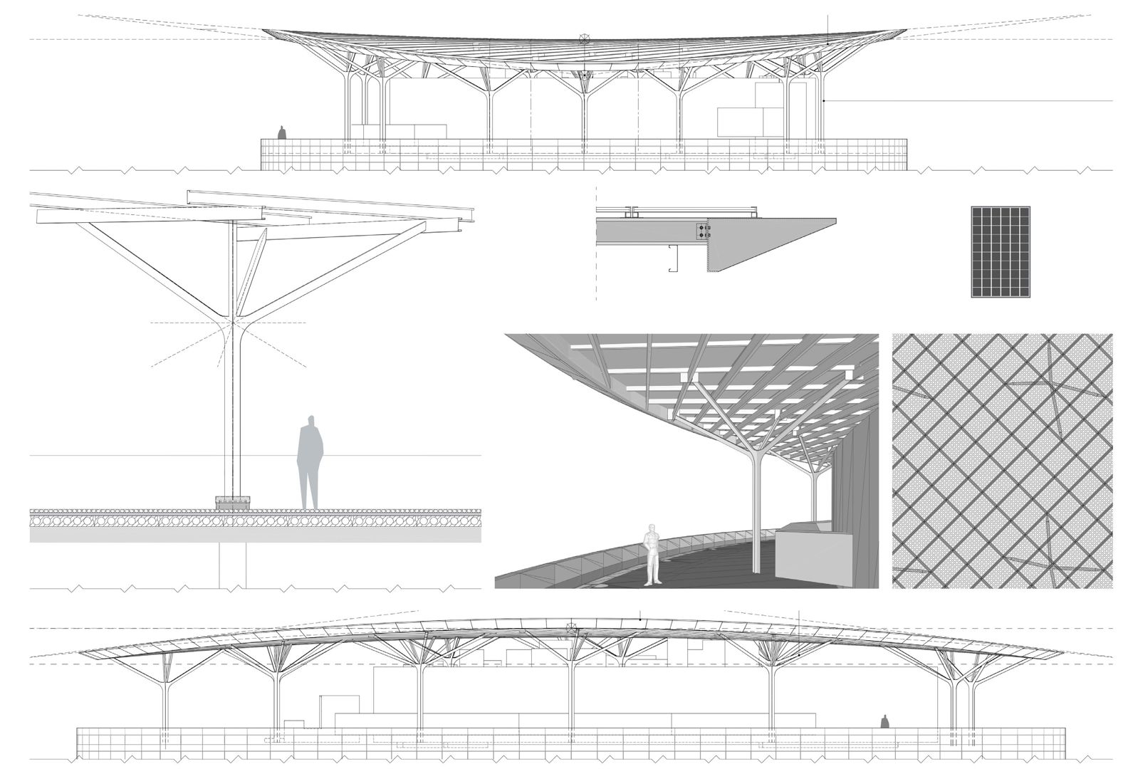 Voor de ondersteuning van de luifel ontwierpen de ingenieurs een lichte, gebogen draagstructuur in gaasvorm. Deze werd opgebouwd uit standaardelementen en rust op een reeks metalen profielschachten die de lasten verdelen over de bestaande constructie. De ingreep respecteert dus de structuur van het bestaande gebouw en vermijdt onnodige verzwaring.