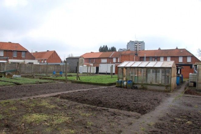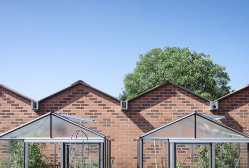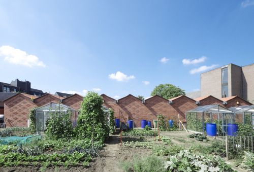 Uiteindelijk besloot de opdrachtgever toch niet om glazen serres neer te zetten, maar garageboxen in baksteen. Geïnspireerd door de omgeving kozen ze een rode baksteen en golfplaten daken. Vormelijk doen de garages denken aan de glazen serres van buurtbewoners die ondertussen op het terrein verschenen. De wateropvang van de golfplaten daken zorgt voor irrigatie van de moestuinen. “We zijn er afgelopen zomer nog eens gaan kijken, en het project bloeit nu, letterlijk en figuurlijk. De buurtbewoners gebruiken het echt en zijn ook dankbaar voor die ruimte. Het was de start van ons bureau en het zegt nog altijd heel veel over wie we zijn.”