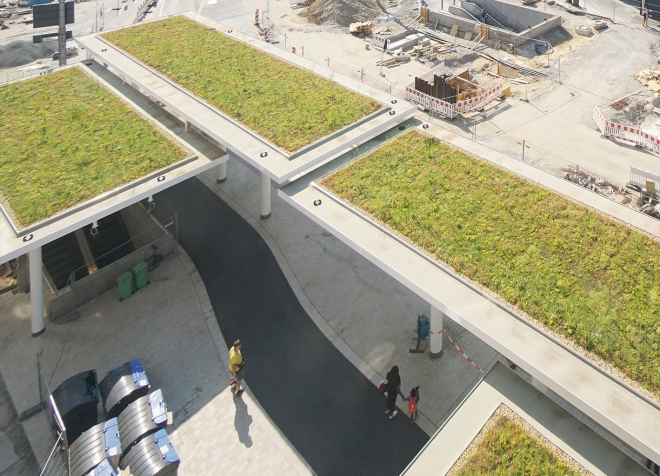 Groendak op nieuwgebouwde luifel op het Jahnplatz plein