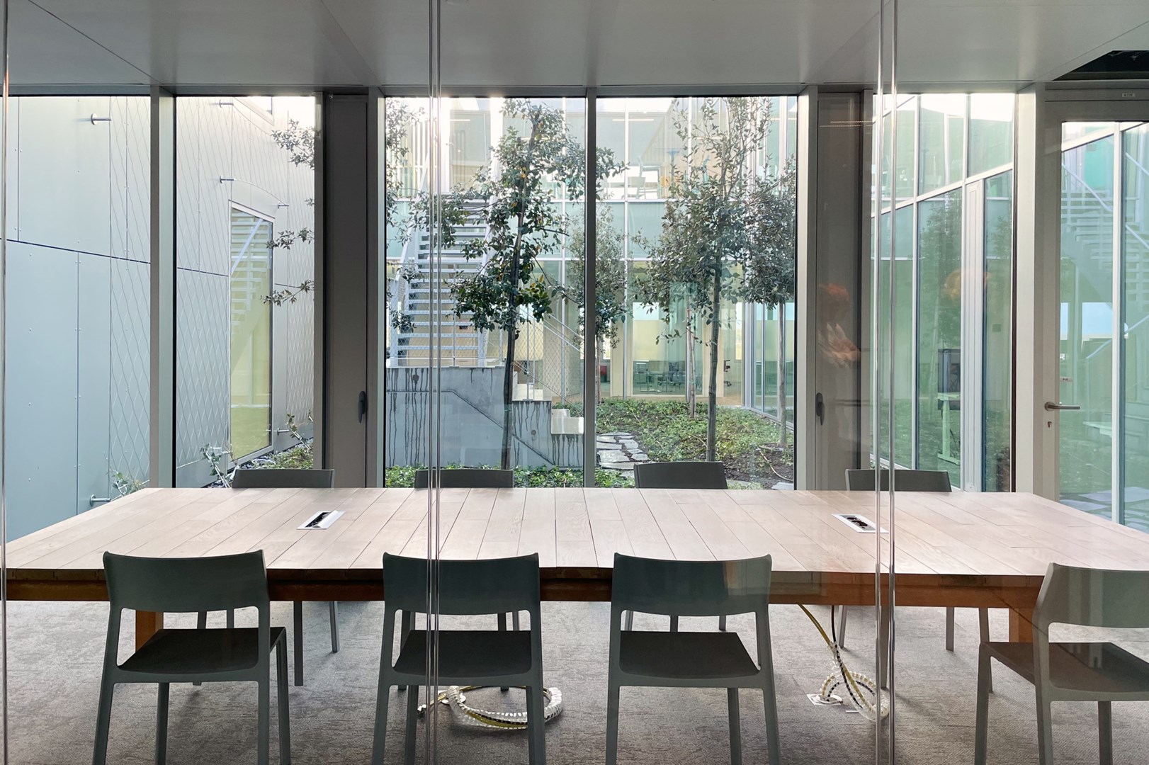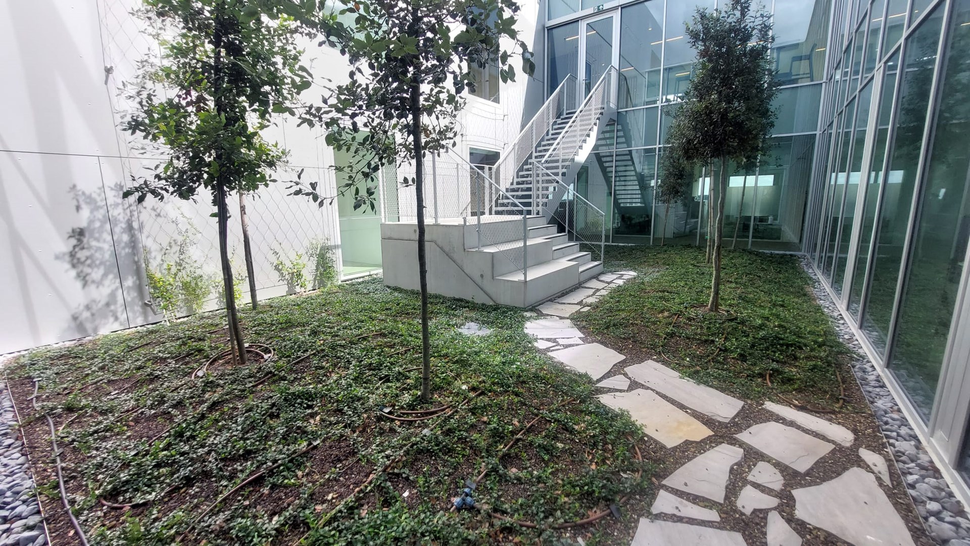 De tweede binnentuin heeft een andere functie. "Hier bevindt zich een grote centrale trap die vanuit de bovenliggende verdiepingen neerkomt. Deze trap en de daktuin eromheen kunnen dienen als een plek voor informele vergaderingen of zelfs als een occasionele aula waar voordrachten kunnen worden bijgewoond. In deze tuin plaatsten we steeneiken (Quercus Ilex), een groenblijvende boomsoort, met een onderbeplanting van Vinca Minor ‘Alba’, ook wel kleine maagdenpalm genoemd."