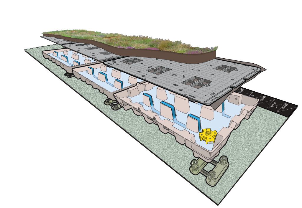Groendaken fungeren als een spons en bufferen zo heel wat regenwater, maar uiteindelijk is de opslagcapaciteit beperkt. Met honingraatplaten worden tegenwoordig al grotere volumes regenwater gestockeerd. Het nadeel is volgens Jo Tourwe dat je zo echter een zwembad op je dak krijgt: “Als er 5 centimeter water op het dak staat en er zit ergens een lek: dat wil je niet meemaken. Omdat lekkende daken nog steeds voor problemen zorgen, hebben we in de Oasis-opbouw een oplossing gevonden. We plaatsen eigenlijk een soort ‘opvangbakken’ onder een groendak, maar het past ook onder zonnepanelen, terrassen of grinddaken."