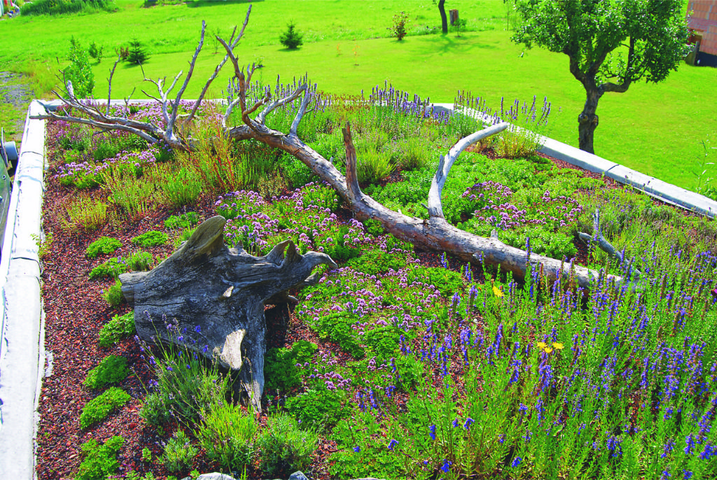 Kleine waterpartijen die gevoed worden door regenwater zijn ideaal voor insecten en vogels en plantvrije kiezelzones (als biotoop voor kleinere insecten). Het gebruik van dood hout op het dak is een aanrader (als habitat voor o.a. kevers, bijen, vliegen en mieren) en als voedingsbodem voor mossen. Natuurlijk mogen ook bijenhotels niet ontbreken.