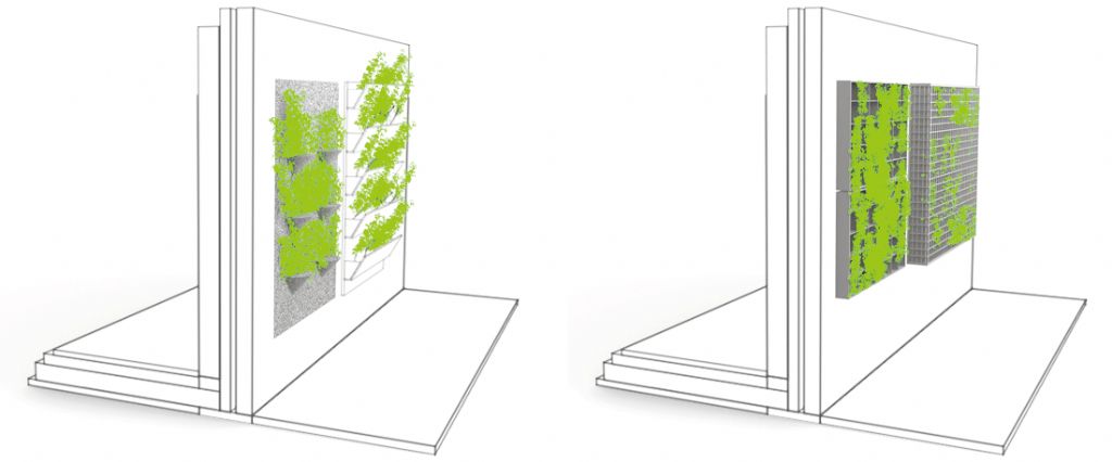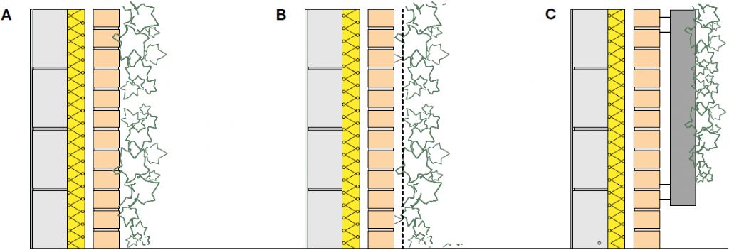 Soms staat men ietwat wantrouwig tegenover groene wanden omdat bepaalde klimplanten aanleiding kunnen geven tot een beschadiging van de muren. Dit kan echter vermeden worden door de juiste planten en, indien nodig, klimhulpen toe te passen. Bij muren waarvan men vermoedt dat er schade kan optreden door directe begroening (zie afbeelding 1A), kan men bijvoorbeeld beter opteren voor groene wanden van het type B of C (zie afbeelding 1).