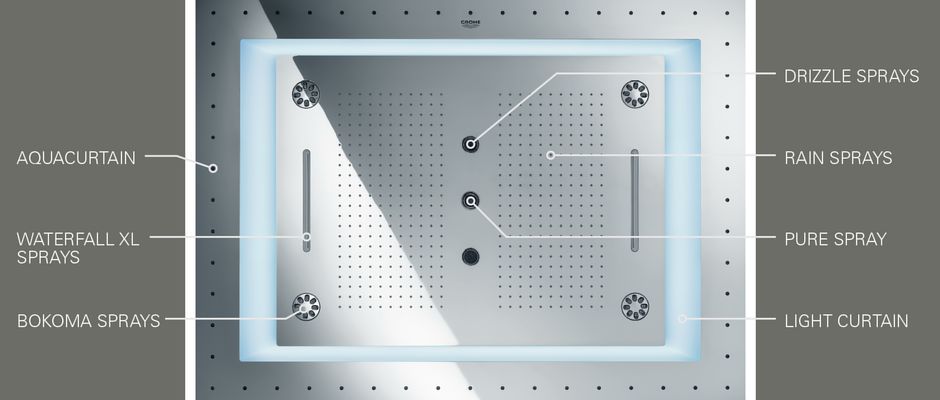 GROHE wil met AquaSymphony een allesomvattende douche-ervaring voor alle zintuigen belichamen. De luxueuze douche wordt met de hand vervaardigd in Lahr (Duitsland), en heeft een grootte van 1,016 mm x 762 mm. AquaSymphony combineert natuurlijke en kunstmatige spa-omgevingen om een spa-gevoel te creëren.