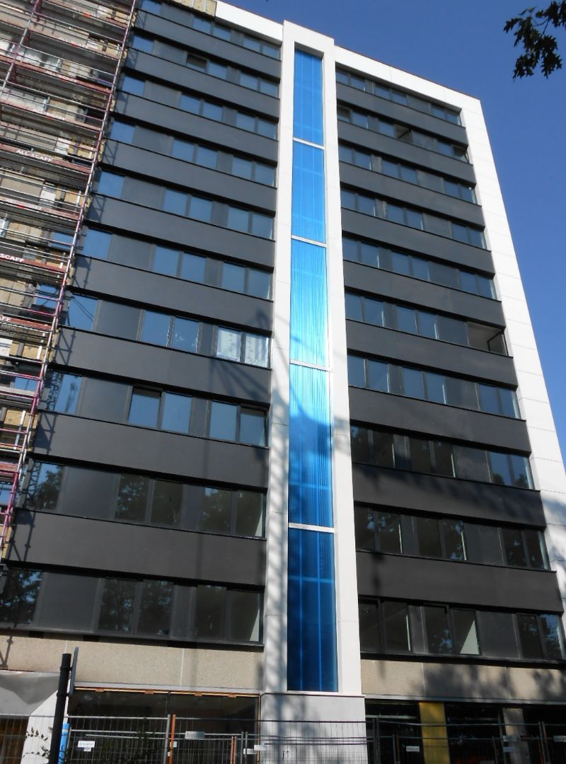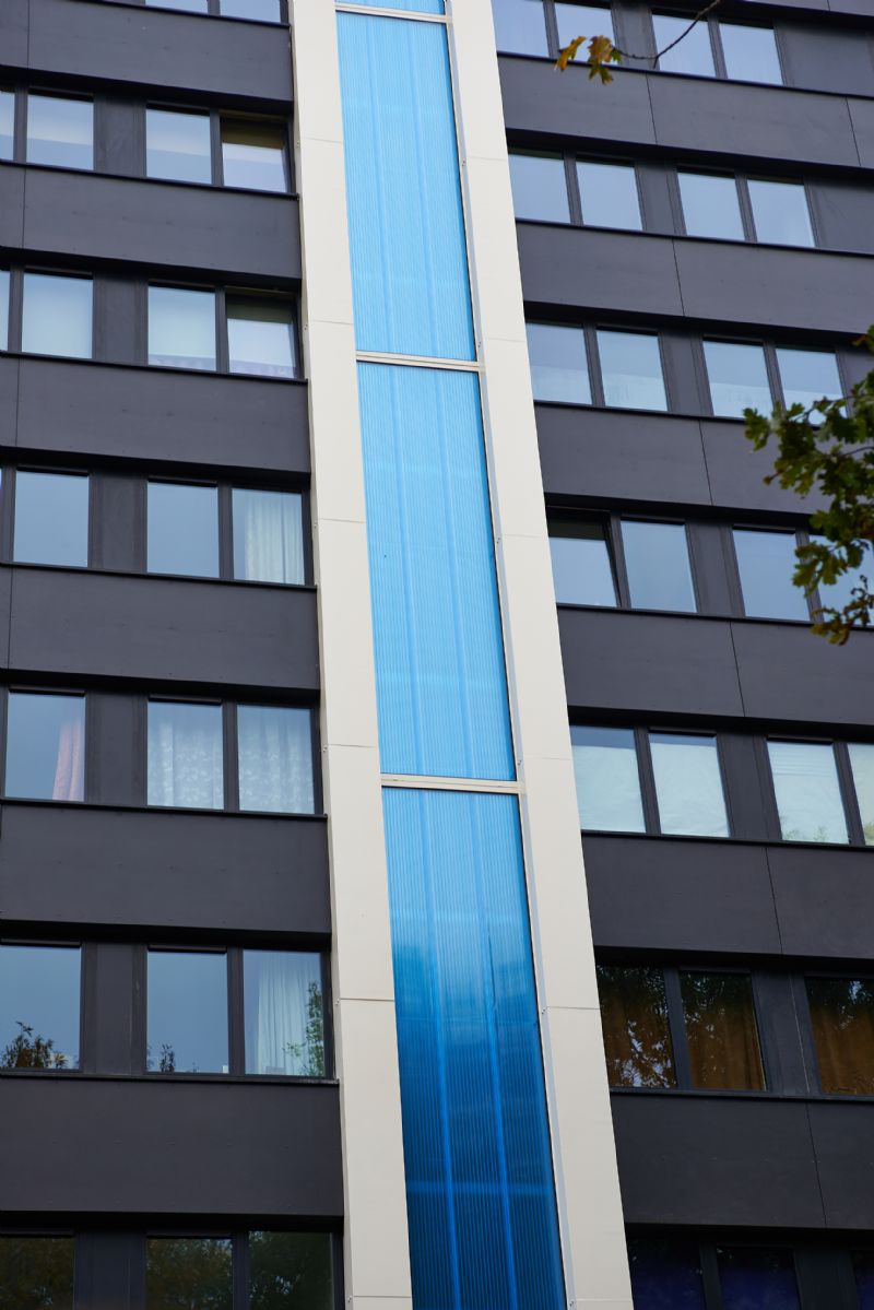 Het wat doffe gebouw is nu lichter en bevat meer kleur. De traphallen kregen een gevel van blauw polycarbonaat, waardoor ze helderder zijn dan daarvoor. De rest van de buitenzijde krijgt twee soorten Colormat gevelplaten van SVK voor een moderne look. Als basis gebruikten Piet Keppens en Jackie Schelfout daarvoor de witte Jasmine en als invulling de donkergrijze Charcoal.