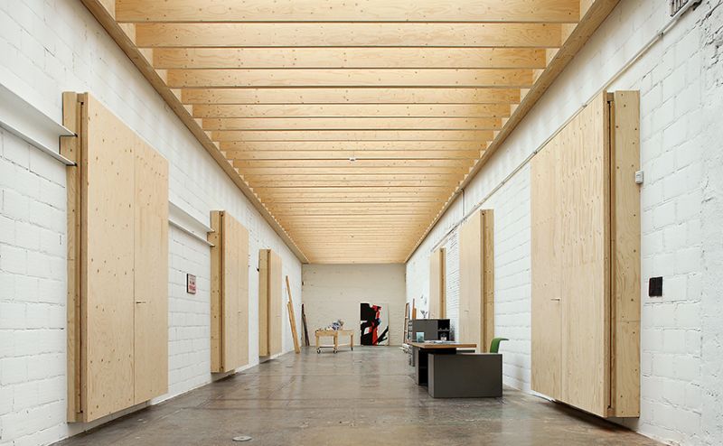 "Het atelier vormt een reis doorheen een reeks compleet verschillende werelden," vertelt Tijl Vanmeirhaeghe van Haerynck Vanmeirhaeghe architecten. "De ruimtes hebben elk een verschillend karakter." Een centraal atelier zorgt voor de toegang tot het atelier, de opslagruimte, de bibliotheek, de projectieruimte, een tekenkamer, bureau, patio, de studio en de garage. De dubbele deuren in de hal verbergen de toegang tot deze ruimtes.