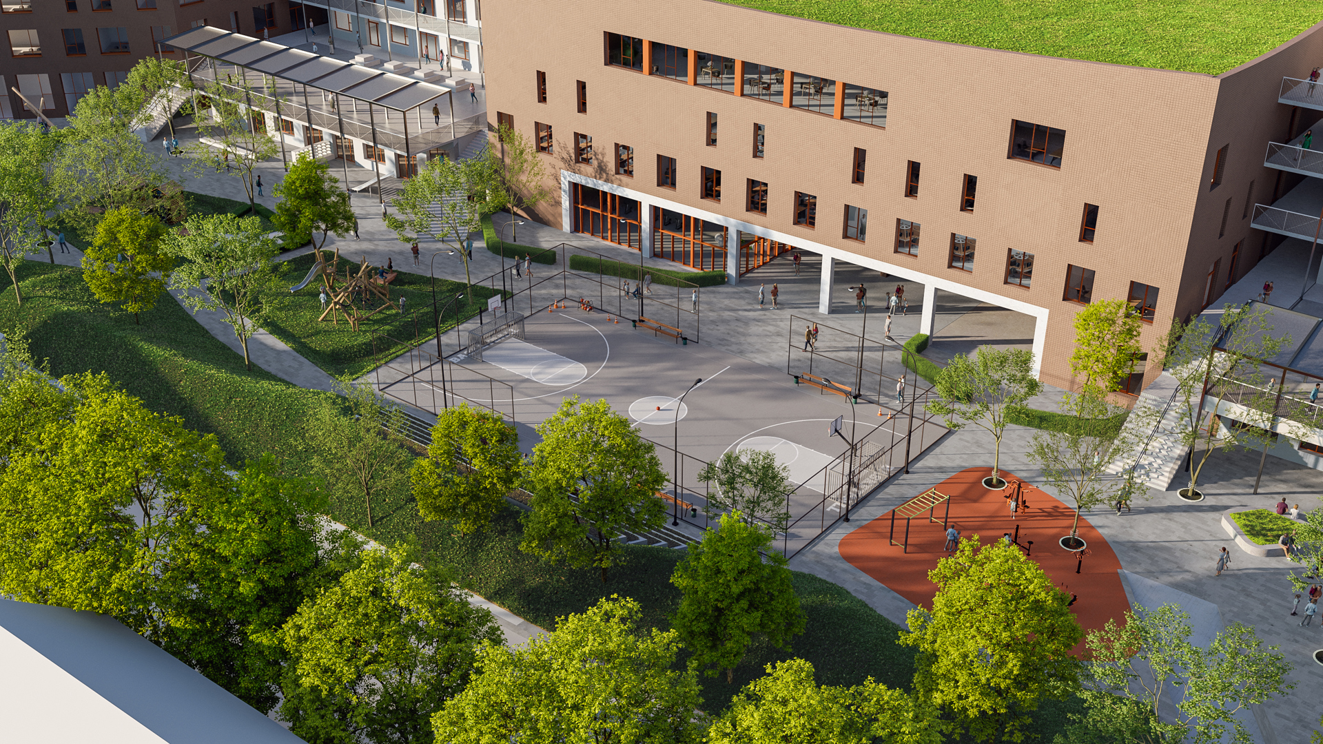 De nieuwe Campus Stream bestaat uit een kinderdagverblijf, een basisschool (Stroomboot) en een secundaire school (GO!4TECH) waar ASO-, TSO-, BSO- en STEM-richtingen worden aangeboden. De site bevat ook polyvalente ruimtes voor volwassenenonderwijs én gedeelde sportinfrastructuur die toegankelijk blijft buiten de schooluren. Dat vraagt om een doordachte aanpak op vlak van veiligheid, toegankelijkheid en flexibiliteit – precies waar ASSA ABLOY in uitblinkt.