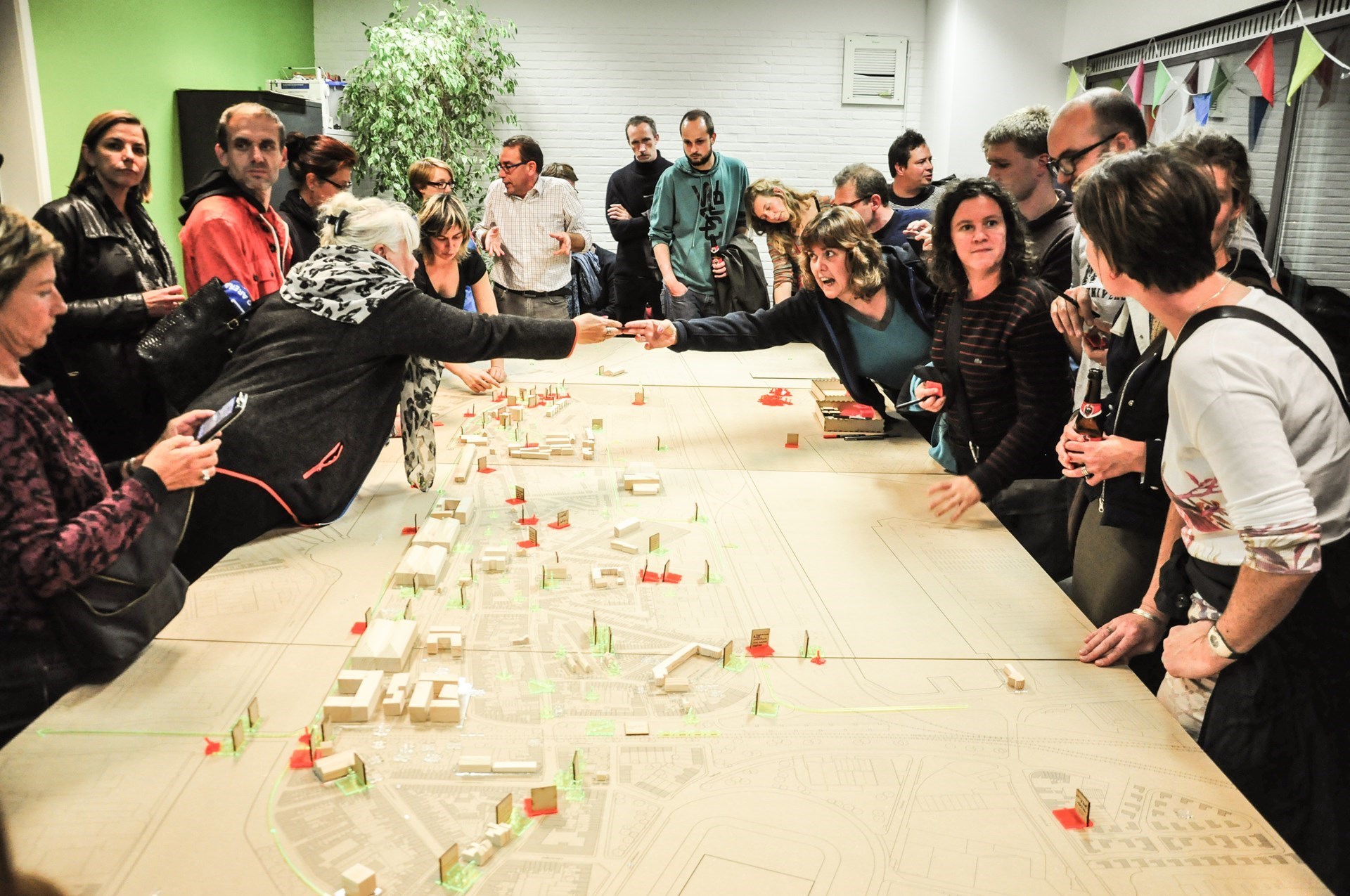 Maarten: “Wij waren met een aantal architecten en stedelijk planners actief in burgerbewegingen die zich inzetten voor de stad en hadden de indruk dat er een kloof was tussen de ontwerppraktijk en precies dat maatschappelijk engagement. Daarom zijn we op zoek gegaan naar een nieuwe rol als facilitator tussen de ontwerppraktijk en haar stakeholders. Wij geloven heel sterk in co-creatie, want hoewel er al pogingen waren om aan participatie te doen, gebeurde dit op een nogal lineaire manier en vaak te laat in het proces. Wij zijn tools voor co-creatieve processen beginnen ontwikkelen en hebben daar een businessmodel rond kunnen opbouwen.”