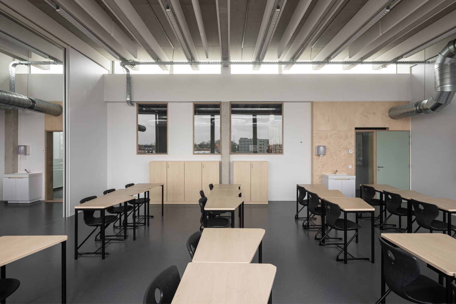 De ventilatie gebeurt met een CO2-gestuurd systeem D. De nodige maatregelen tegen oververhitting worden voorzien onder de vorm van deels vaste, deels mobiele zonwering – in functie van de oriëntatie –, opengaande daklichten en aangepaste beglazing. Zelfs zonder het in rekening brengen van de voorziene pv-panelen zal het nieuwe gebouw ‘BEN’ zijn.