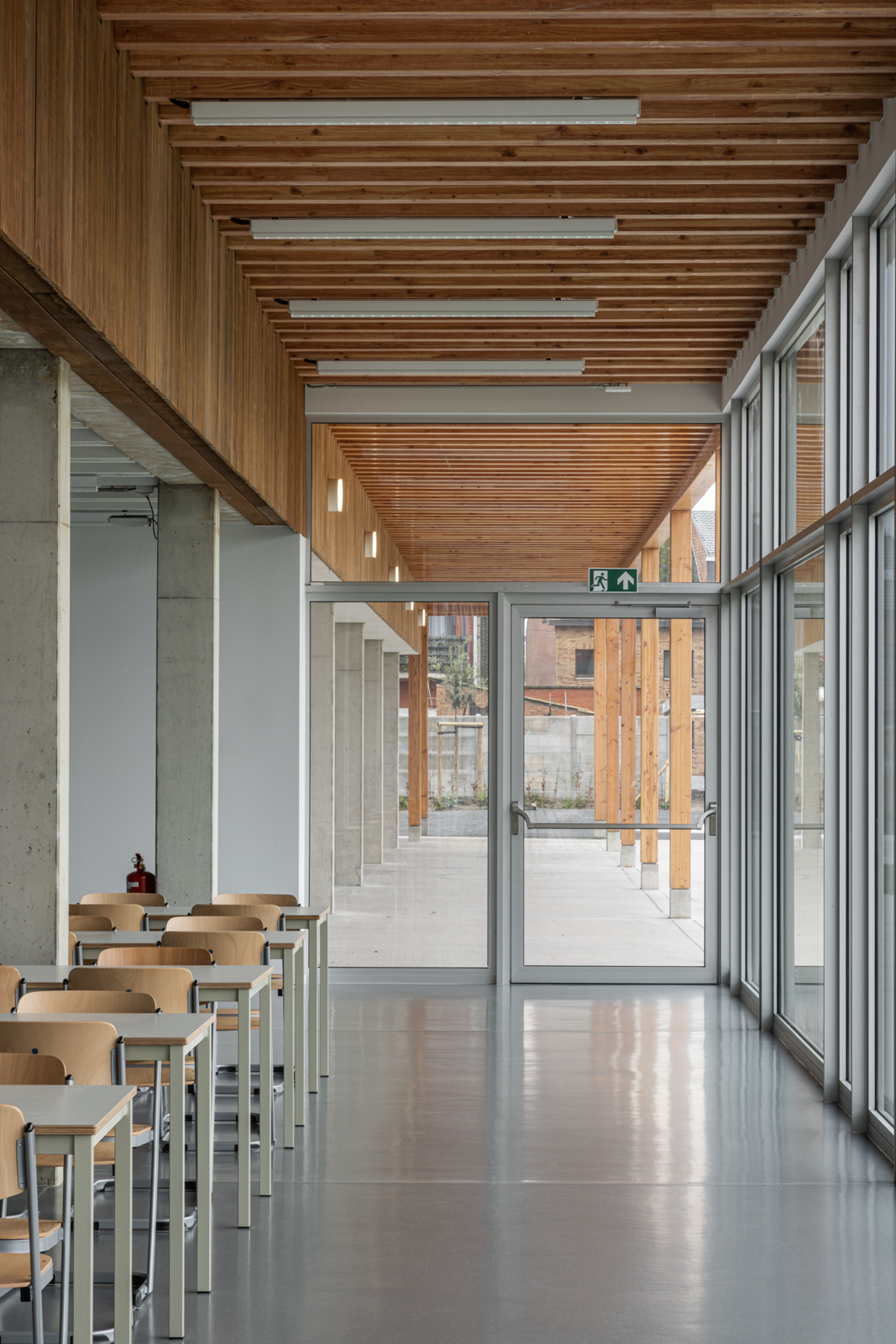 Er werd gekozen voor een betonnen draagstructuur met een logische maatvoering die vrij invulbaar is en duidelijk losgekoppeld wordt van de afwerkingslagen. Om zo aanpasbaar mogelijk te bouwen, werd het betonskelet gecombineerd met een invulling die grotendeels uit JUUNOO-wanden bestaat. Op de verdiepingen kunnen door het grid van structuur en gevelritmering op eenvoudige wijze klassen en ateliers samengevoegd, opgesplitst of naar de gang opengemaakt worden.