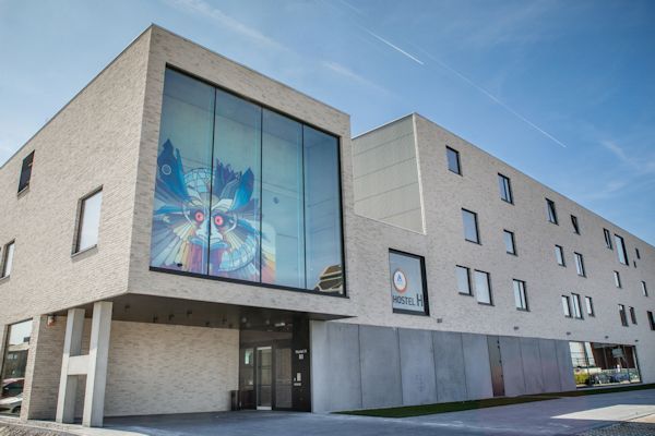 Bij de brede overdekte inkomhal lopen we meteen langs de ‘H’ door. “Die steunkolom in de vorm van de ‘H’ is het eerste wat opvalt als je het gebouw betreedt,” vertelt architect Danny Windmolders van F.C.S. “De ‘H’ in de naamgeving is overigens interessant omdat ze multi-interpretabel is en origineler klinkt dan pakweg Youth Hostel Hasselt op z’n Amerikaans of het (te) Vlaamse en saaie Jeugdherberg Hasselt."
