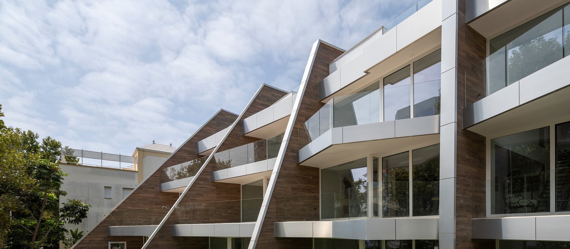 Iván Faltoyano: De hele vorm van het gebouw is aangepast aan het erg smalle perceel. De voorgevel is gericht naar het zuidoosten, om het licht in de ochtend maximaal te benutten en het te weren tijdens de warmste middaguren. Tegelijkertijd zorgt de dynamische gevel met de zonweringen voor privacy en intimiteit op de terrassen. In de scheidingswanden zijn bovendien technische voorzieningen en diensten geïntegreerd.