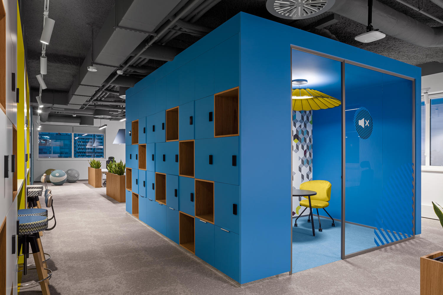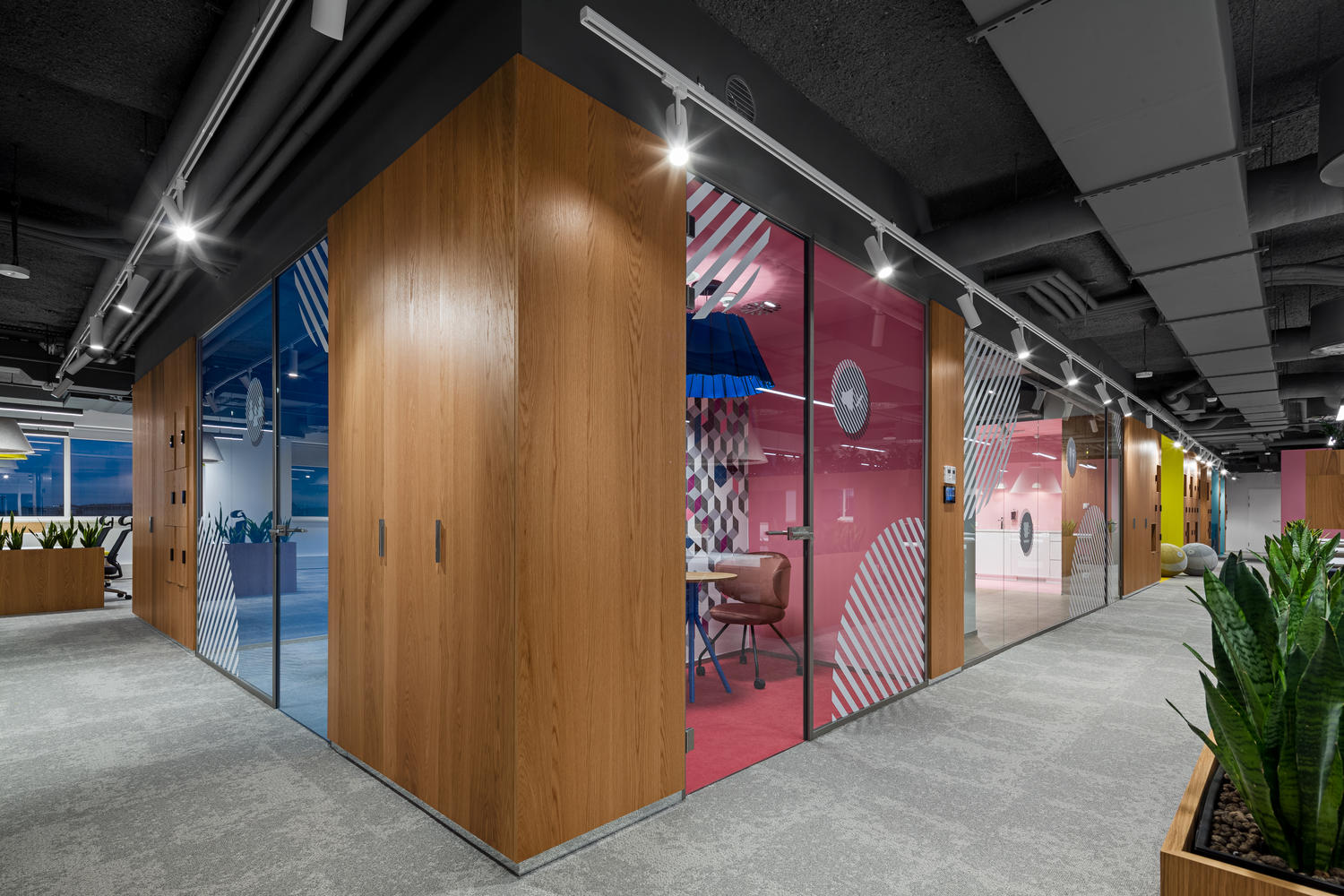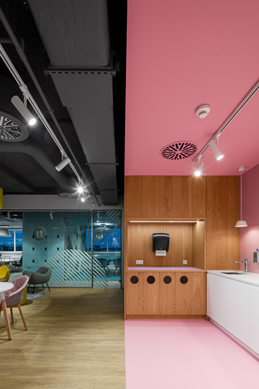 De studio besloot een unieke maar vrolijke ruimte te creëren met een gedurfd en energiek kleurenpalet. Zij hebben een variatie aan ruimtelijke en grafische vormen gebruikt, evenals een eclectische mix van meubilair en decoratieve objecten, om een geheel nieuwe look te creëren in het kantoor.