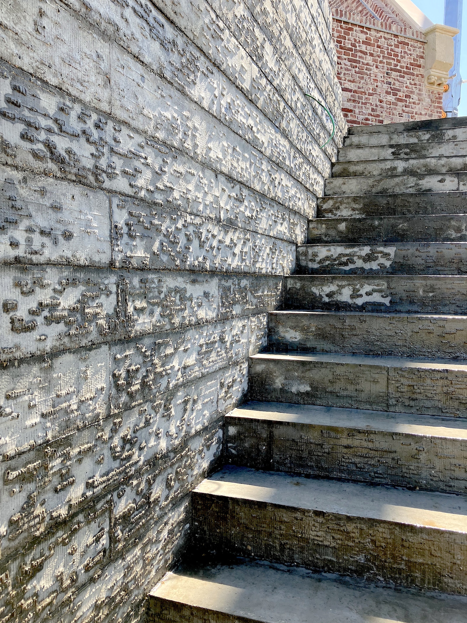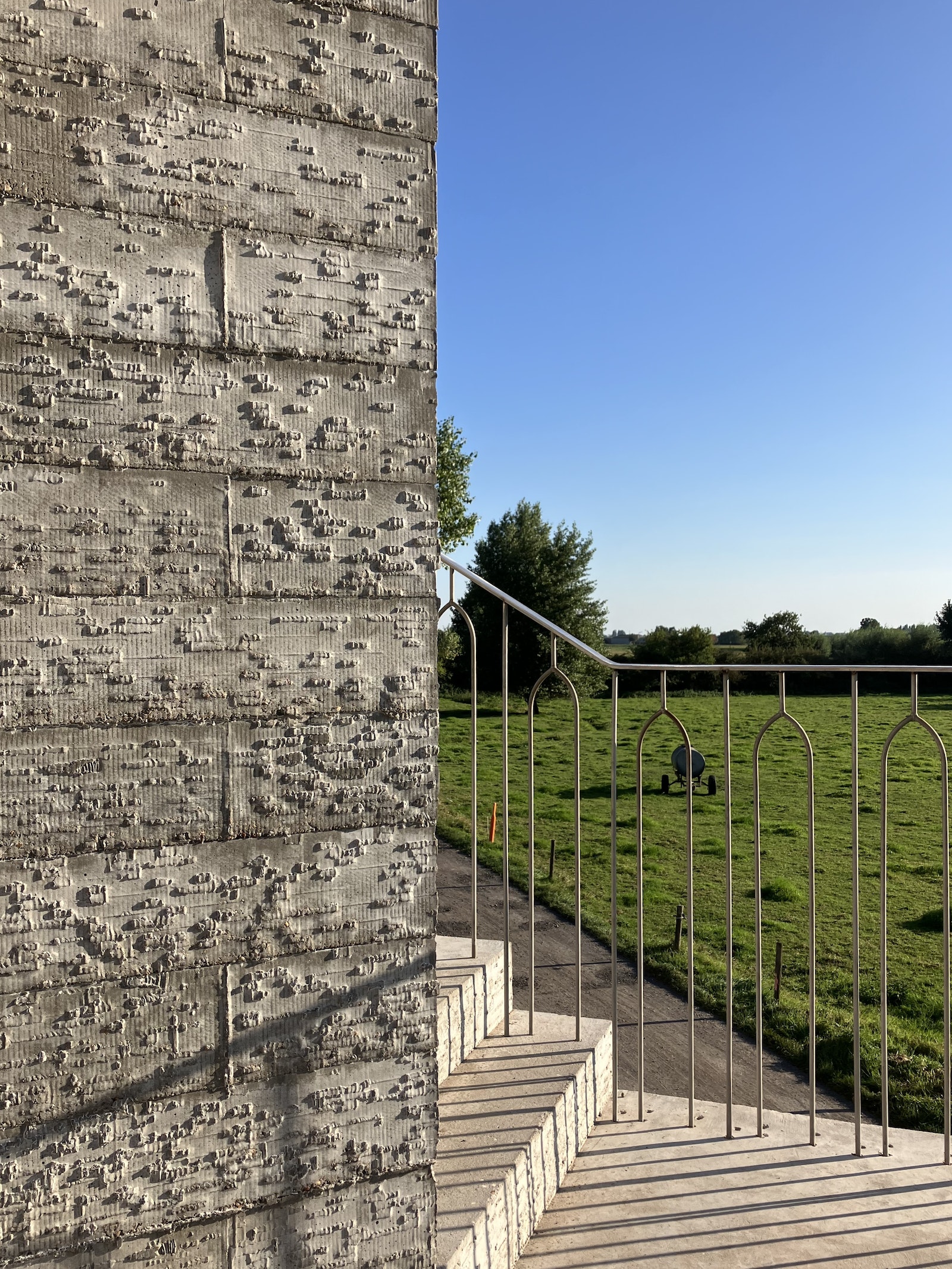 Lie Bormans: “Het idee ontstond tijdens mijn thesis bij het R[x]D-team, door onze gedeelde interesse om de overlap tussen architectuur en robotica te verkennen. Terwijl robotica doorgaans focust op het creëren van identieke resultaten, zochten wij naar een manier om het proces te verrijken met creativiteit, onvoorspelbaarheid en menselijke ‘imperfecties’. De ontwerper versterkt de robot en de robot versterkt de ontwerper, in een inspirerende loop van creatie en design. Na talloze experimenten kwamen we uit bij het ontwerpen van unieke betontexturen. Daarbij vond ik het zelf enorm belangrijk om dat creatieve proces te koppelen aan de praktijk. Dat leidde initieel tot een interessante casestudie bij het architectenbureau DMOA en finaal tot het eerste volledig gerealiseerde proefproject.”