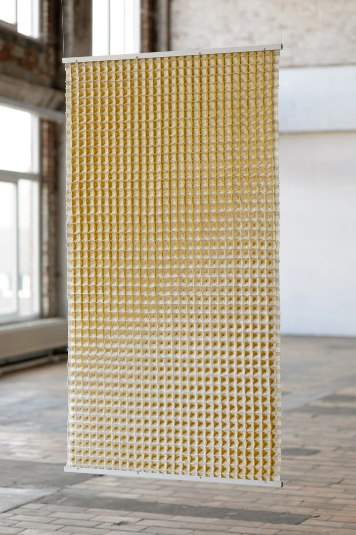 Van een speels museum voor beeldende kunst en een groene stadsroute die wijken opnieuw verbindt tot een circulair living lab met modulaire gevel en een sculpturale toren: het zijn maar enkele van de 27 projecten die een Henry van de Velde Award 26 in de wacht slepen. Maar wie met de Gold, Silver of Bronze Award binnen zijn categorie naar huis gaat, komen we pas te weten tijdens de feestelijke uitreiking in Bozar op dinsdag 27 januari 2026. Architectura telt af naar dat moment door in een artikelenreeks een aantal winnende architectuur- en interieurprojecten onder de aandacht te brengen. Vandaag: Shifting Colors door Esther Van Schuylenbergh, een serie geweven panelen in monumentale wafelbindingen, waarin subtiele verschuivingen van kleur ten opzichte van structuur vloeiende kleurovergangen creëren.