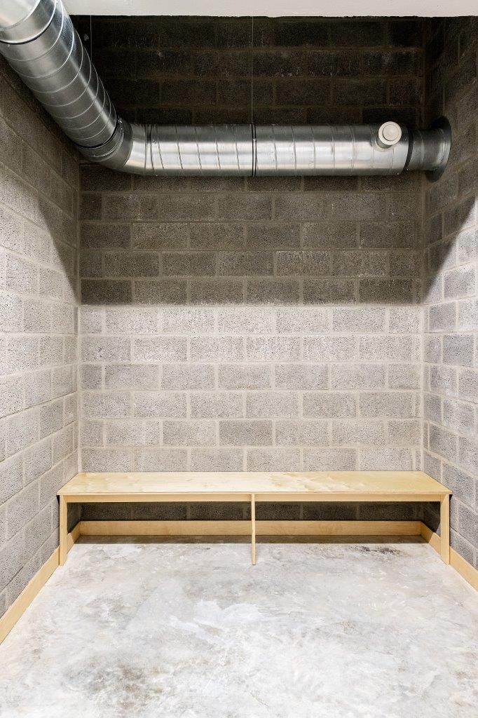 Centraal staat de grote oefenzaal. Links ervan liggen behandelruimtes, rechts kleedkamers, douches en personeelsruimtes. De nieuwe wanden in lichtgewichtbeton stoppen op hoogte van de dakbalken. Het bovenste gedeelte bestaat uit beglazing bij de behandelkamers en uit akoestische houten panelen aan de andere kant. Deze spiegeling versterkt het gevoel van symmetrie.
