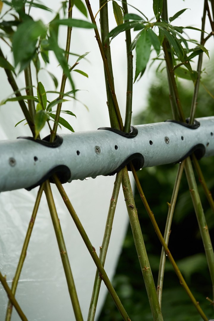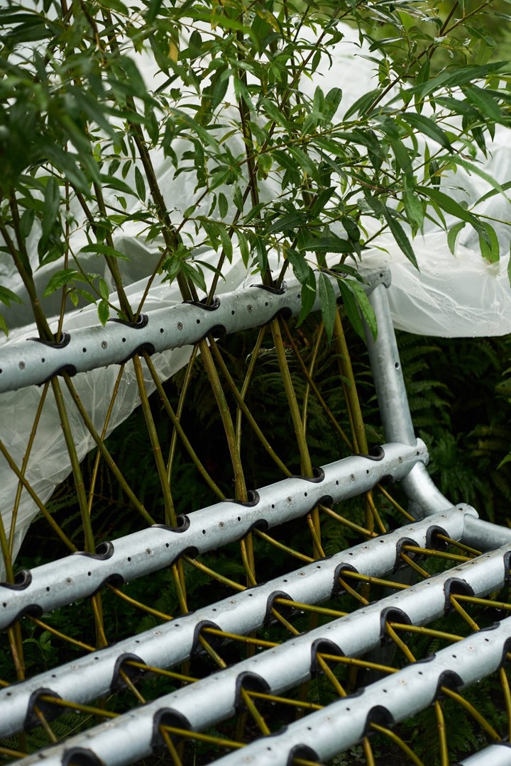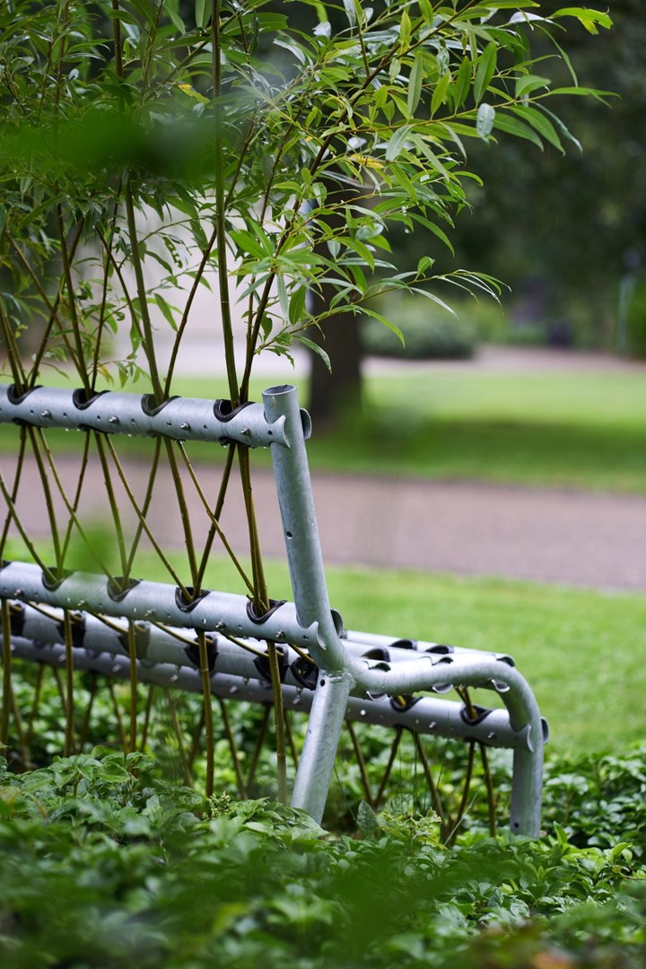 Het Belgische ontwerpbureau Studio Part heeft een demonteerbare metalen mal ontwikkeld die jonge wilgentenen aanmoedigt om uit te groeien tot een zelfdragende bank. Tenir - ‘vasthouden’ in het Frans - is ontworpen om de wilgentakken te leiden zodat ze in elkaar verstrengeld raken en een gebogen vorm volgen die uiteindelijk een comfortabele zitplaats biedt.